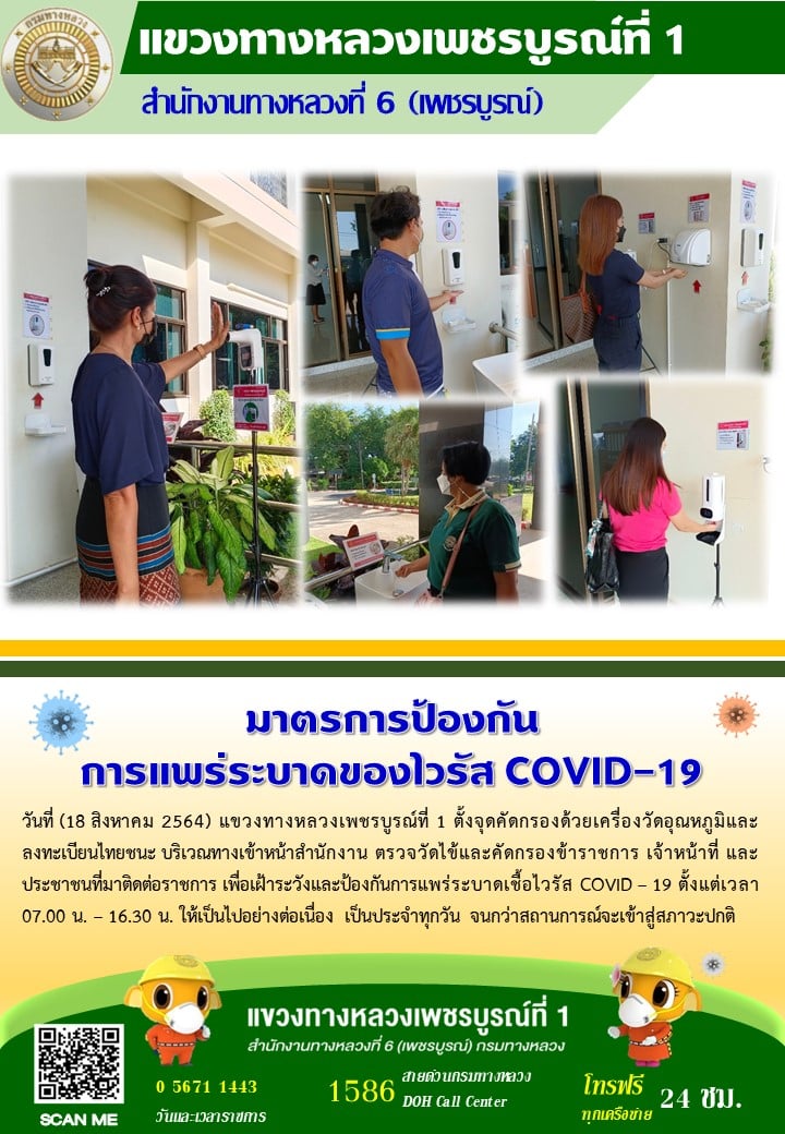 แขวงทางหลวงเพชรบูรณ์ที่ 1 จัดตั้งตู้พ่นน้ำยาฆ่าเชื้อ และจุดคัดกรองด้วยเครื่องวัดอุณหภูมิ วันที่ 18 สิงหาคม 2564 ตั้งแต่เวลา 07.00 น. – 16.30