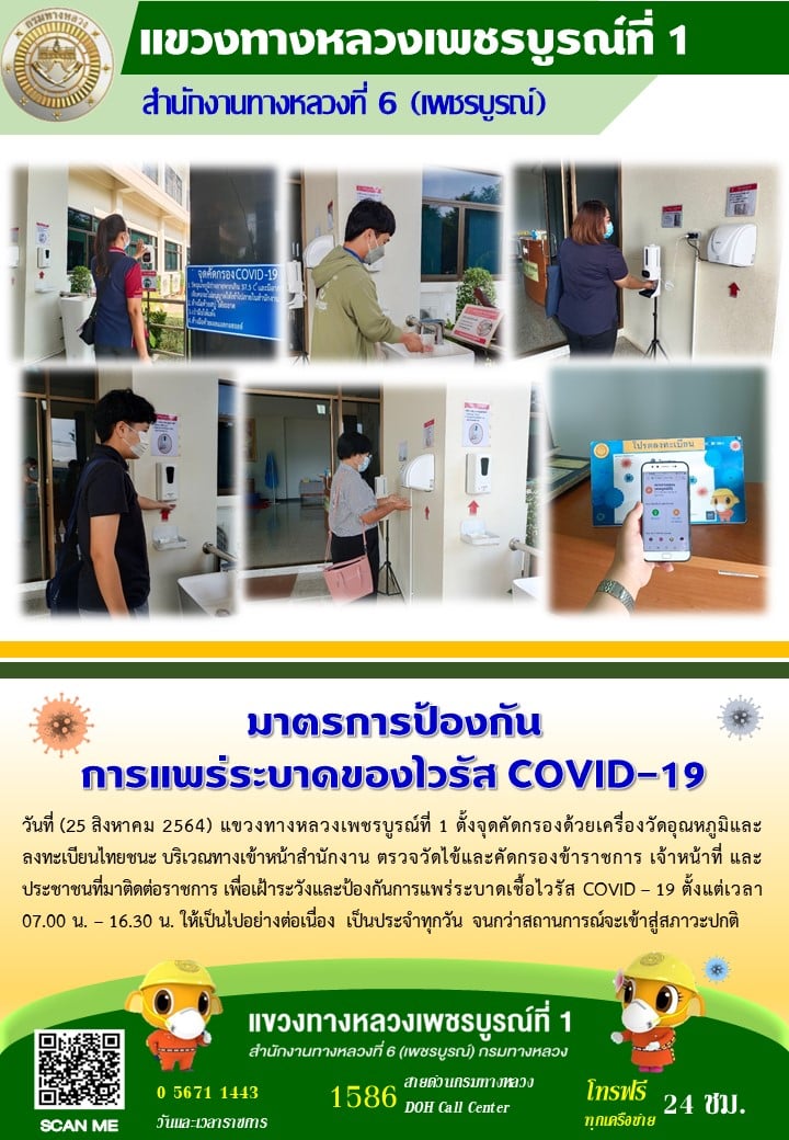 แขวงทางหลวงเพชรบูรณ์ที่ 1 จัดตั้งตู้พ่นน้ำยาฆ่าเชื้อ และจุดคัดกรองด้วยเครื่องวัดอุณหภูมิ วันที่ 25 สิงหาคม 2564 ตั้งแต่เวลา 07.00 น. – 16.30
