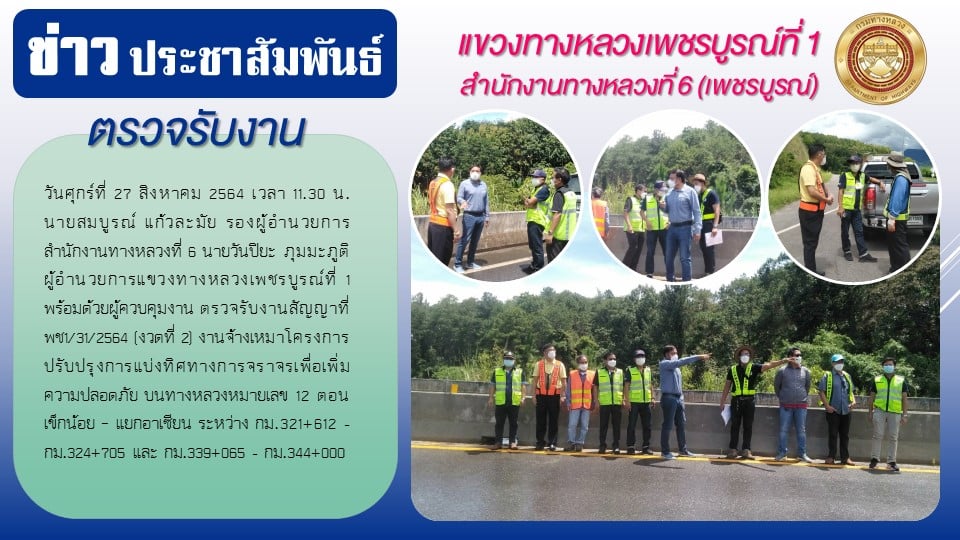 วันศุกร์ที่ 27 สิงหาคม 2564 เวลา 11.30 น. นายสมบูรณ์ แก้วละมัย รองผู้อำนวยการสำนักงานทางหลวงที่ 6 นายวันปิยะ ภุมมะภูติ ผู้อำนวยการแขวงทางหลวงเพชรบูรณ์ที่ 1 พร้อมด้วยผู้ควบคุมงาน ตรวจรับงานสัญญาที่ พช1/31/2564 (งวดที่ 2) งานจ้างเหมาโครงการปรับปรุงการแบ่งทิศทางการจราจรเพื่อเพิ่มความปลอดภัย บนทางหลวงหมายเลข 12 ตอน เข็กน้อย – แยกอาเซียน ระหว่าง กม.321+612 - กม.324+705 และ กม.339+065 - กม.344+000