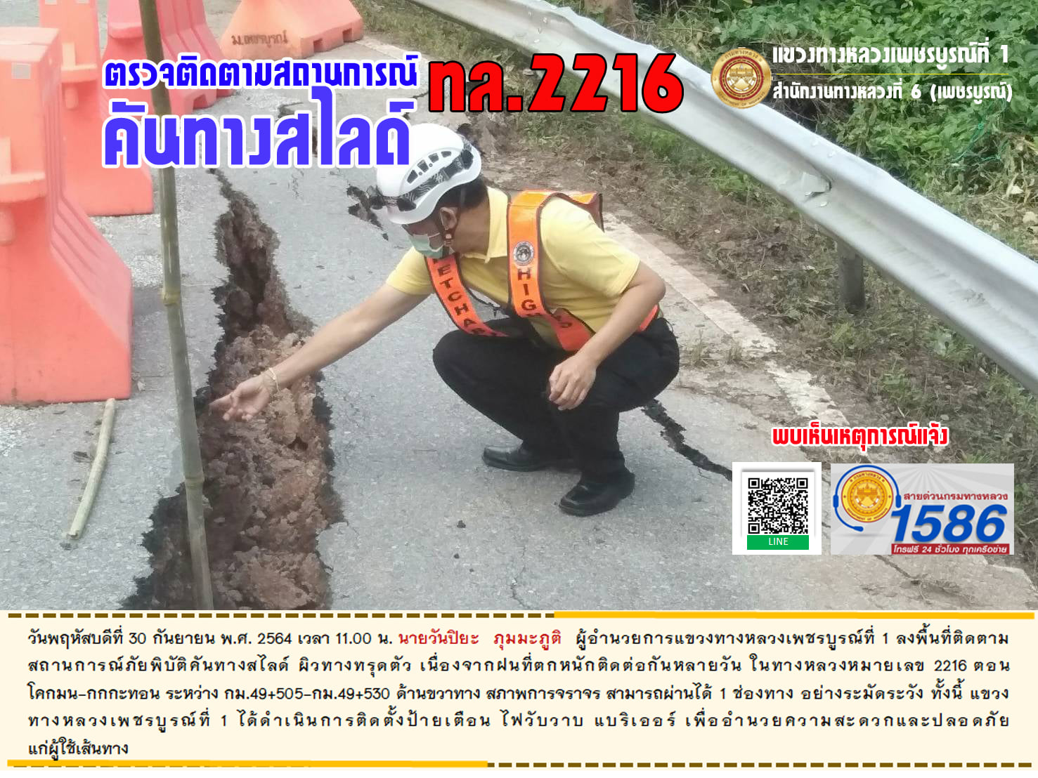 วันพฤหัสบดีที่ 30 กันยายน พ.ศ. 2564 เวลา 11.00 น. นายวันปิยะ ภุมมะภูติ ผู้อำนวยการแขวงทางหลวงเพชรบูรณ์ที่ 1 ลงพื้นที่ติดตามสถานการณ์ภัยพิบัติคันทางสไลด์ ผิวทางทรุดตัว เนื่องจากฝนที่ตกหนักติดต่อกันหลายวัน ในทางหลวงหมายเลข 2216 ตอน โคกมน-กกกะทอน ระหว่าง กม.49+505-กม.49+530 ด้านขวาทาง สภาพการจราจร สามารถผ่านได้ 1 ช่องทาง อย่างระมัดระวัง