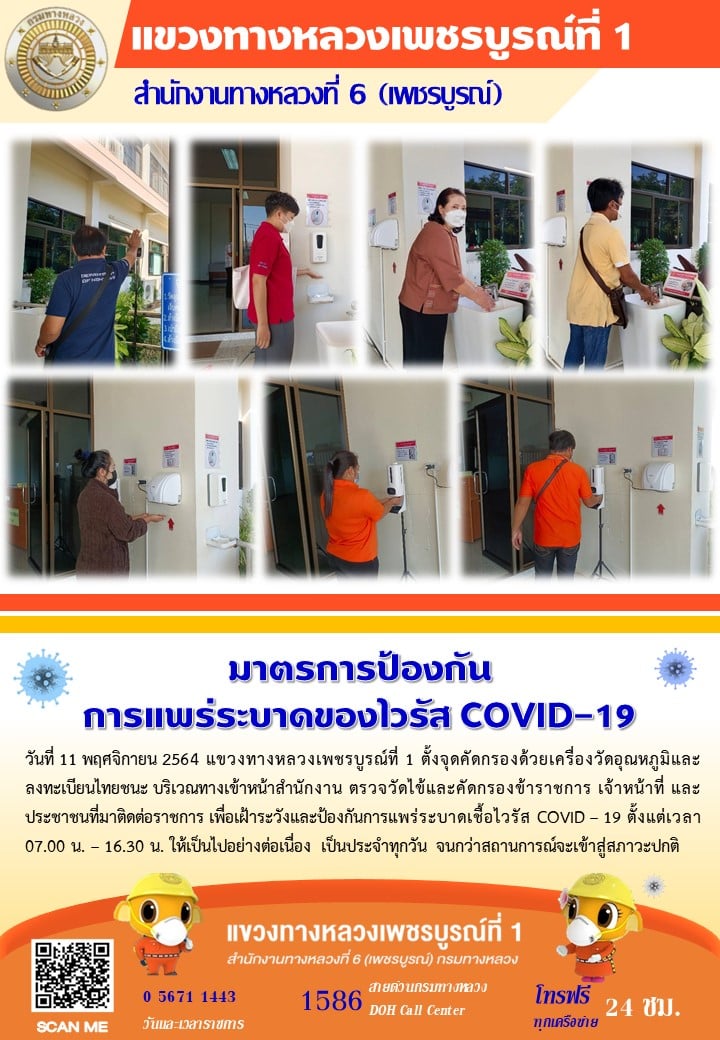 แขวงทางหลวงเพชรบูรณ์ที่ 1 จัดตั้งตู้พ่นน้ำยาฆ่าเชื้อ และจุดคัดกรองด้วยเครื่องวัดอุณหภูมิ วันที่ 11 พฤศจิกายน 2564 ตั้งแต่เวลา 07.00 น. – 16.30 น.