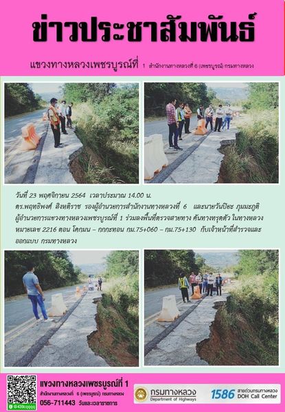 วันที่ 23 พฤศจิกายน 2564 เวลาประมาณ 14.00 น. ดร.พฤทธิพงศ์ สิงหติราช รองผู้อำนวยการสำนักงานทางหลวงที่ 6 และนายวันปิยะ ภุมมะภูติ ผู้อำนวยการแขวงทางหลวงเพชรบูรณ์ที่ 1 ร่วมลงพื้นที่ตรวจสายทาง คันทางทรุดตัว ในทางหลวงหมายเลข 2216 ตอน โคกมน – กกกะทอน กม.75+060 – กม.75+130 กับเจ้าหน้าที่สำรวจและออกแบบ กรมทางหลวง