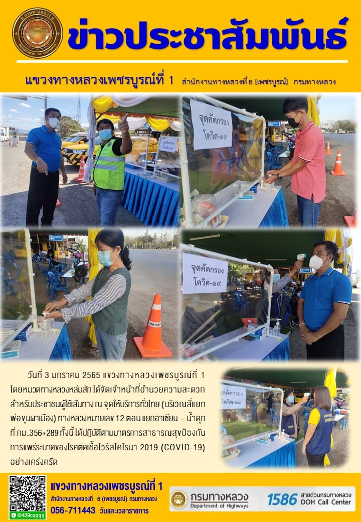 วันที่ 3 มกราคม 2565 แขวงทางหลวงเพชรบูรณ์ที่ 1 โดยหมวดทางหลวงหล่มสัก ได้จัดเจ้าหน้าที่อำนวยความสะดวก สำหรับประชาชนผู้ใช้เส้นทาง ณ จุดให้บริการทั่วไทย (บริเวณสี่แยกพ่อขุนผาเมือง) ทางหลวงหมายเลข 12 ตอน แยกอาเซียน - น้ำดุก ที่ กม.356+289 ทั้งนี้ ได้ปฏิบัติตามมาตรการสาธารณสุขป้องกันการแพร่ระบาดของโรคติดเชื้อไวรัสโคโรนา 2019 (COVID-19) อย่างเคร่งครัด