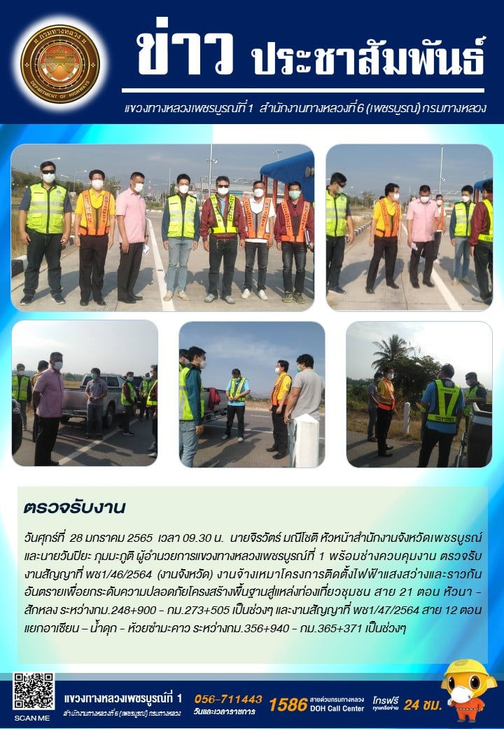 วันศุกร์ที่ 28 มกราคม 2565 เวลา 09.30 น. นายจิรวัตร์ มณีโชติ หัวหน้าสำนักงานจังหวัดเพชรบูรณ์ และนายวันปิยะ ภุมมะภูติ ผู้อำนวยการแขวงทางหลวงเพชรบูรณ์ที่ 1 พร้อมช่างควบคุมงาน ตรวจรับงานสัญญาที่ พช1/46/2564 (งานจังหวัด) งานจ้างเหมาโครงการติดตั้งไฟฟ้าแสงสว่างและราวกันอันตรายเพื่อยกระดับความปลอดภัยโครงสร้างพื้นฐานสู่แหล่งท่องเที่ยวชุมชน สาย 21 ตอน หัวนา - สักหลง ระหว่างกม.248+900 - กม.273+505 เป็นช่วงๆ และงานสัญญาที่ พช1/47/2564 สาย 12 ตอน แยกอาเซียน – น้ำดุก - ห้วยซำมะคาว ระหว่างกม.356+940 - กม.365+371 เป็นช่วงๆ