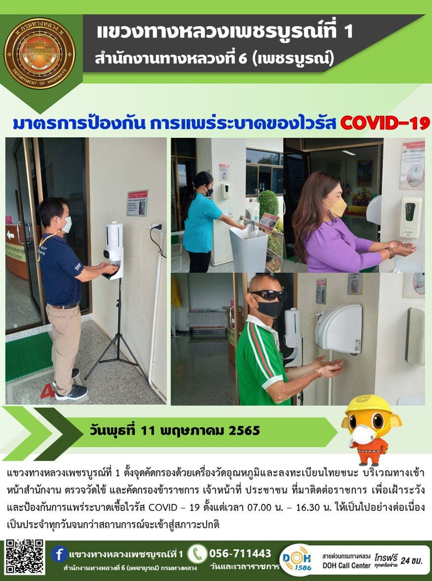 วันพุธที่ 11 พฤษภาคม 2565 แขวงทางหลวงเพชรบูรณ์ที่ 1 ตั้งจุดคัดกรองด้วยเครื่องวัดอุณหภูมิและลงทะเบียนไทยชนะ บริเวณทางเข้าหน้าสำนักงาน ตรวจวัดไข้ และคัดกรองข้าราชการ เจ้าหน้าที่ ประชาชน ที่มาติดต่อราชการ เพื่อเฝ้าระวังและป้องกันการแพร่ระบาดเชื้อไวรัส COVID – 19 ตั้งแต่เวลา 07.00 น. – 16.30 น. ให้เป็นไปอย่างต่อเนื่อง เป็นประจำทุกวันจนกว่าสถานการณ์จะเข้าสู่สภาวะปกติ