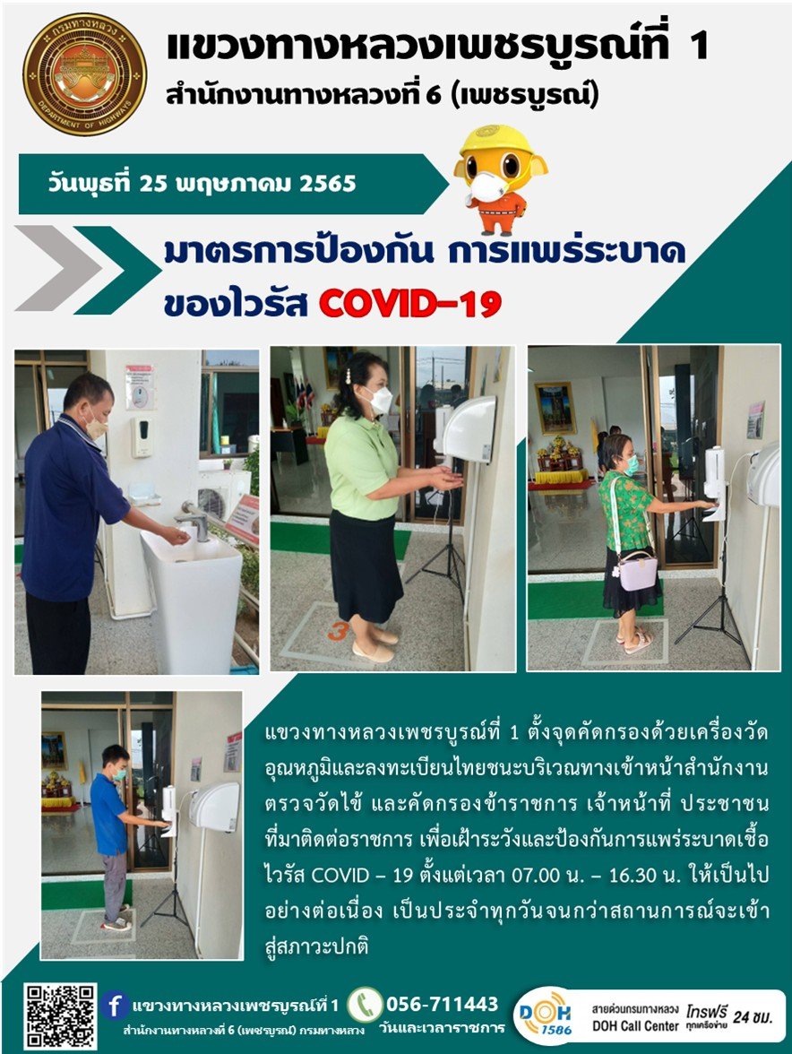 วันพุธที่ 25 พฤษภาคม 2565 แขวงทางหลวงเพชรบูรณ์ที่ 1 ตั้งจุดคัดกรองด้วยเครื่องวัดอุณหภูมิและลงทะเบียนไทยชนะ บริเวณทางเข้าหน้าสำนักงาน ตรวจวัดไข้ และคัดกรองข้าราชการ เจ้าหน้าที่ ประชาชน ที่มาติดต่อราชการ เพื่อเฝ้าระวังและป้องกันการแพร่ระบาดเชื้อไวรัส COVID – 19 ตั้งแต่เวลา 07.00 น. – 16.30 น. ให้เป็นไปอย่างต่อเนื่อง เป็นประจำทุกวันจนกว่าสถานการณ์จะเข้าสู่สภาวะปกติ