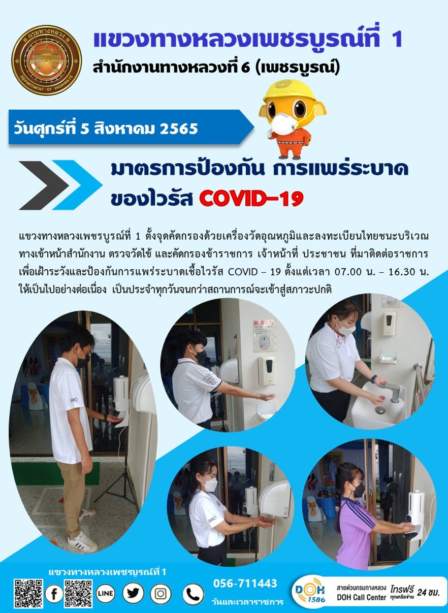 วันศุกร์ที่ 5 สิงหาคม 2565 แขวงทางหลวงเพชรบูรณ์ที่ 1 ตั้งจุดคัดกรองด้วยเครื่องวัดอุณหภูมิและลงทะเบียนไทยชนะ บริเวณทางเข้าหน้าสำนักงาน ตรวจวัดไข้ และคัดกรองข้าราชการ เจ้าหน้าที่ ประชาชน ที่มาติดต่อราชการ เพื่อเฝ้าระวังและป้องกันการแพร่ระบาดเชื้อไวรัส COVID – 19 ตั้งแต่เวลา 07.00 น. – 16.30 น. ให้เป็นไปอย่างต่อเนื่อง เป็นประจำทุกวันจนกว่าสถานการณ์จะเข้าสู่สภาวะปกติ