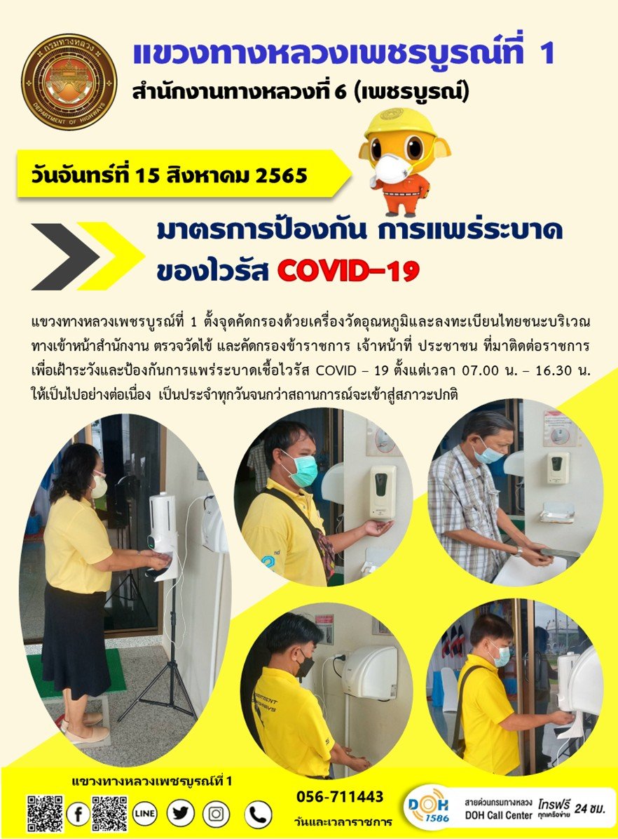 วันจันทร์ที่ 15 สิงหาคม 2565 แขวงทางหลวงเพชรบูรณ์ที่ 1 ตั้งจุดคัดกรองด้วยเครื่องวัดอุณหภูมิและลงทะเบียนไทยชนะ บริเวณทางเข้าหน้าสำนักงาน ตรวจวัดไข้ และคัดกรองข้าราชการ เจ้าหน้าที่ ประชาชน ที่มาติดต่อราชการ เพื่อเฝ้าระวังและป้องกันการแพร่ระบาดเชื้อไวรัส COVID – 19 ตั้งแต่เวลา 07.00 น. – 16.30 น. ให้เป็นไปอย่างต่อเนื่อง เป็นประจำทุกวันจนกว่าสถานการณ์จะเข้าสู่สภาวะปกติ