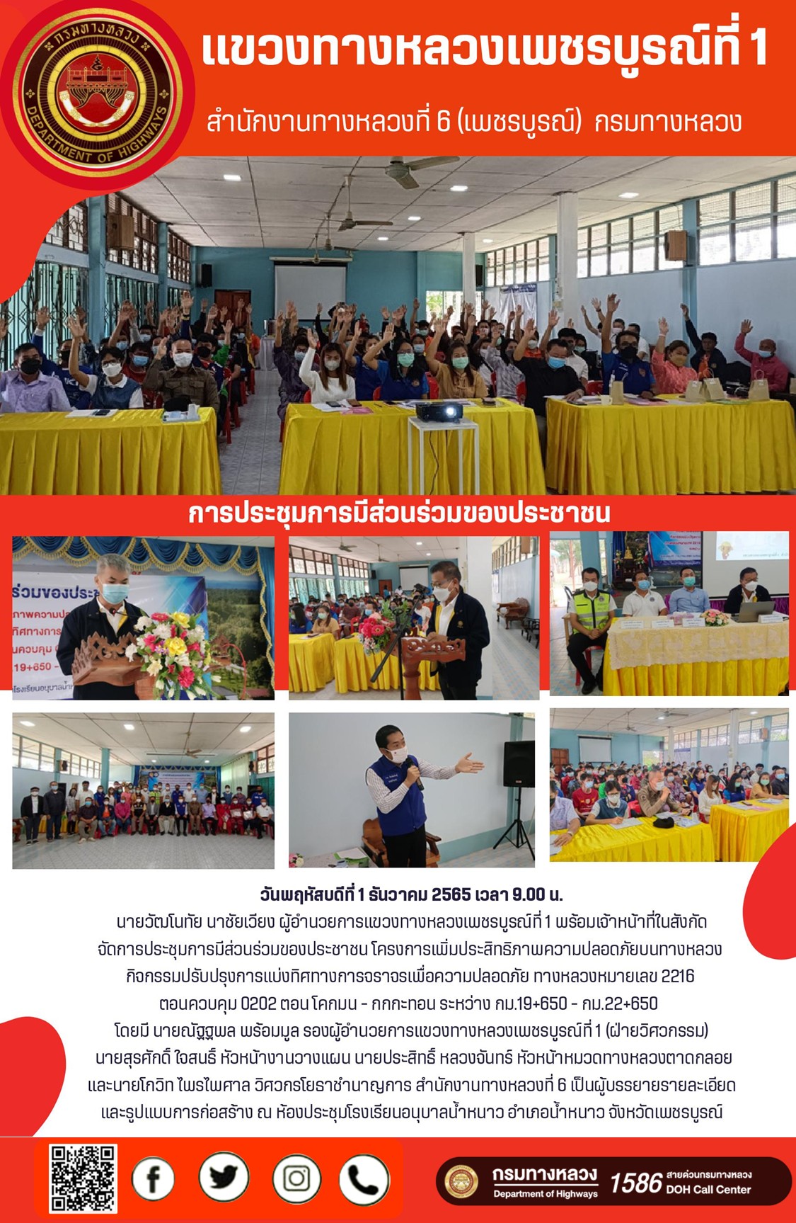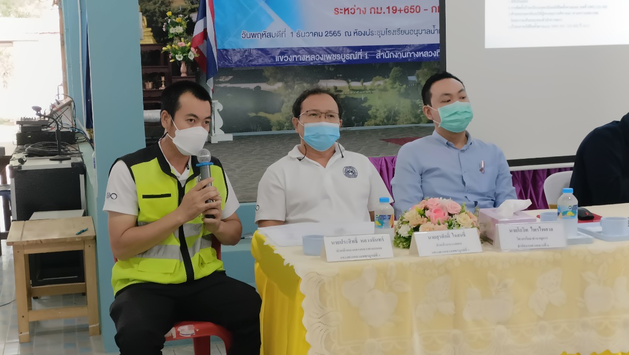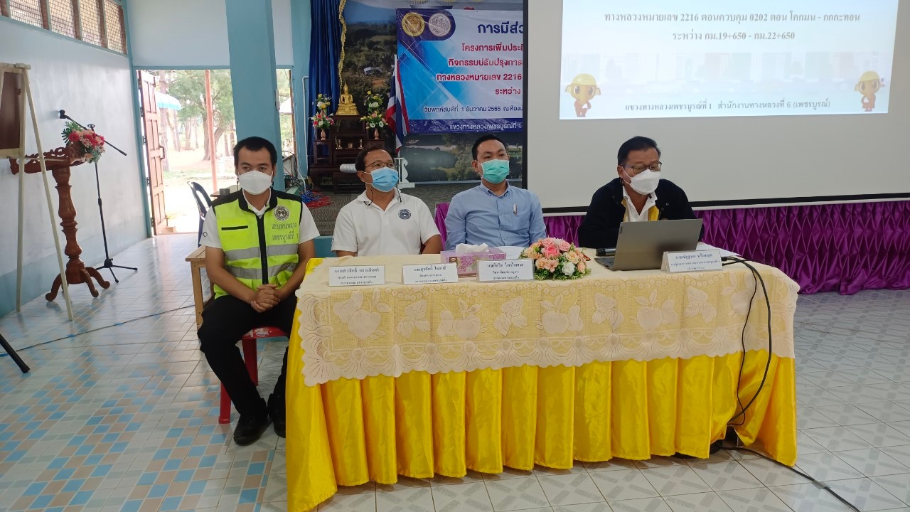 วันพฤหัสบดีที่ 1 ธันวาคม 2565 เวลา 9.00 น. นายวัฒโนทัย นาชัยเวียง ผู้อำนวยการแขวงทางหลวงเพชรบูรณ์ที่ 1 พร้อมเจ้าหน้าที่ในสังกัด จัดการประชุมการมีส่วนร่วมของประชาชน โครงการเพิ่มประสิทธิภาพความปลอดภัยบนทางหลวง กิจกรรมปรับปรุงการแบ่งทิศทางการจราจรเพื่อความปลอดภัย ทางหลวงหมายเลข 2216 ตอนควบคุม 0202 ตอน โคกมน - กกกะทอน ระหว่าง กม.19+650 - กม.22+650 โดยมี นายณัฐฐพล พร้อมมูล รองผู้อำนวยการแขวงทางหลวงเพชรบูรณ์ที่ 1 (ฝ่ายวิศวกรรม) นายสุรศักดิ์ ใจสนธิ์ หัวหน้างานวางเเผน นายประสิทธิ์ หลวงจันทร์ หัวหน้าหมวดทางหลวงตาดกลอย และนายโกวิท ไพรไพศาล วิศวกรโยธาชำนาญการ สำนักงานทางหลวงที่ 6 เป็นผู้บรรยายรายละเอียด และรูปแบบการก่อสร้าง ณ ห้องประชุมโรงเรียนอนุบาลน้ำหนาว อำเภอน้ำหนาว จังหวัดเพชรบูรณ์