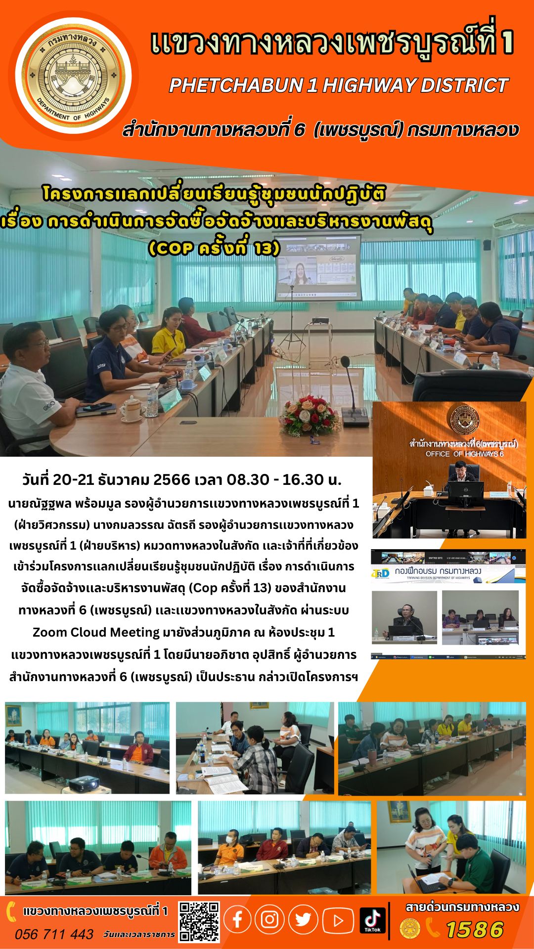 วันที่ 20-21 ธันวาคม 2566 เวลา 08.30 - 16.30 น. นายณัฐฐพล พร้อมมูล รองผู้อำนวยการเเขวงทางหลวงเพชรบูรณ์ที่ 1 (ฝ่ายวิศวกรรม) นางกมลวรรณ ฉัตรถี รองผู้อำนวยการเเขวงทางหลวงเพชรบูรณ์ที่ 1 (ฝ่ายบริหาร) หมวดทางหลวงในสังกัด เเละเจ้าที่ที่เกี่ยวข้อง เข้าร่วมโครงการเเลกเปลี่ยนเรียนรู้ชุมชนนักปฏิบัติ เรื่อง การดำเนินการจัดซื้อจัดจ้างเเละบริหารงานพัสดุ (Cop ครั้งที่ 13) ของสำนักงานทางหลวงที่ 6 (เพชรบูรณ์) เเละเเขวงทางหลวงในสังกัด ผ่านระบบ Zoom Cloud Meeting มายังส่วนภูมิภาค ณ ห้องประชุม 1 แขวงทางหลวงเพชรบูรณ์ที่ 1 โดยมีนายอภิชาต อุปสิทธิ์ ผู้อำนวยการสำนักงานทางหลวงที่ 6 (เพชรบูรณ์) เป็นประธาน กล่าวเปิดโครงการฯ