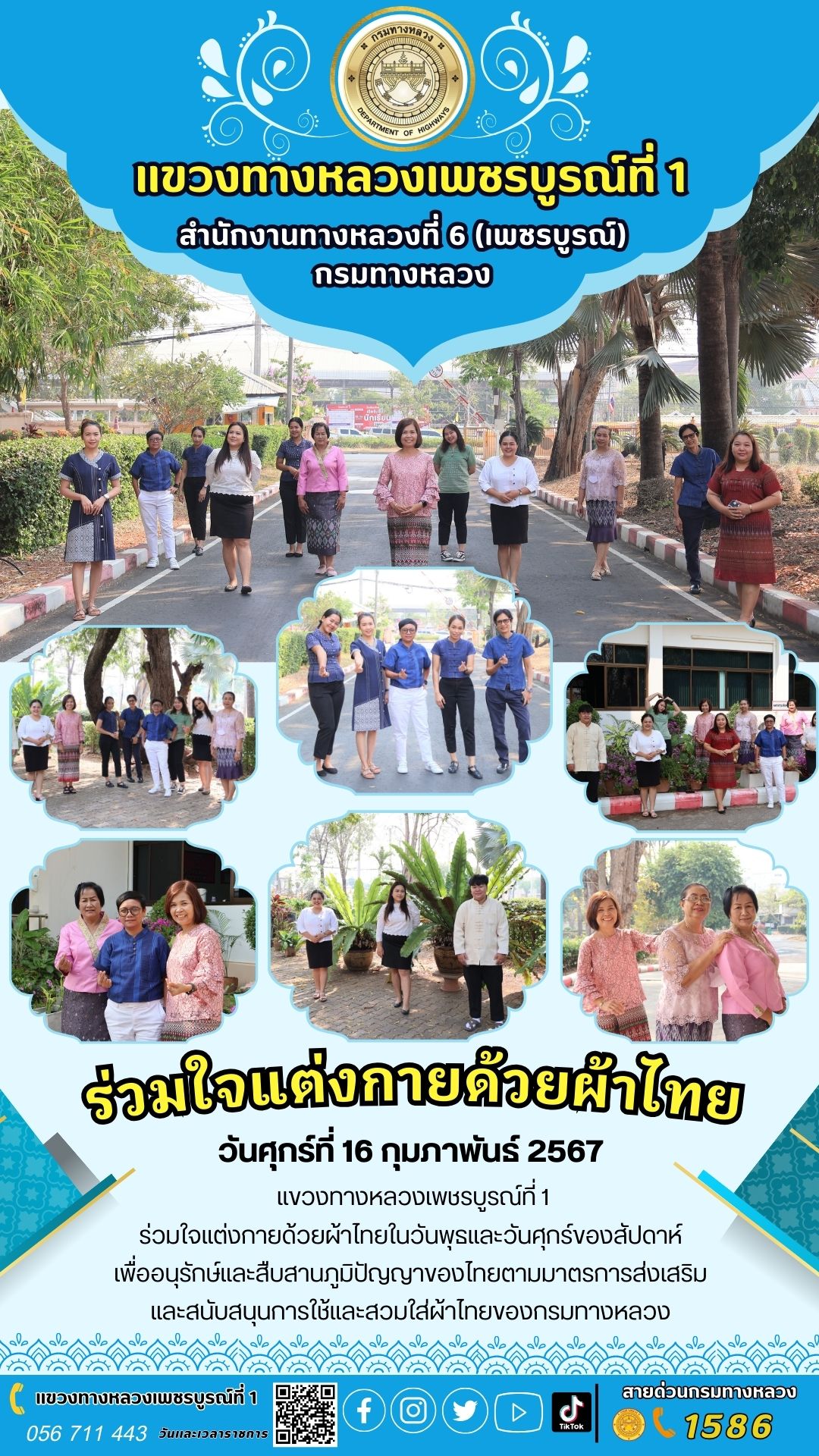 วันศุกร์ที่ 16 กุมภาพันธ์ 2567 แขวงทางหลวงเพชรบูรณ์ที่ 1 ร่วมใจแต่งกายด้วยผ้าไทยในวันพุธและวันศุกร์ของสัปดาห์ เพื่ออนุรักษ์และสืบสานภูมิปัญญาของไทยตามมาตรการส่งเสริมและสนับสนุนการใช้และสวมใส่ผ้าไทยของกรมทางหลวง