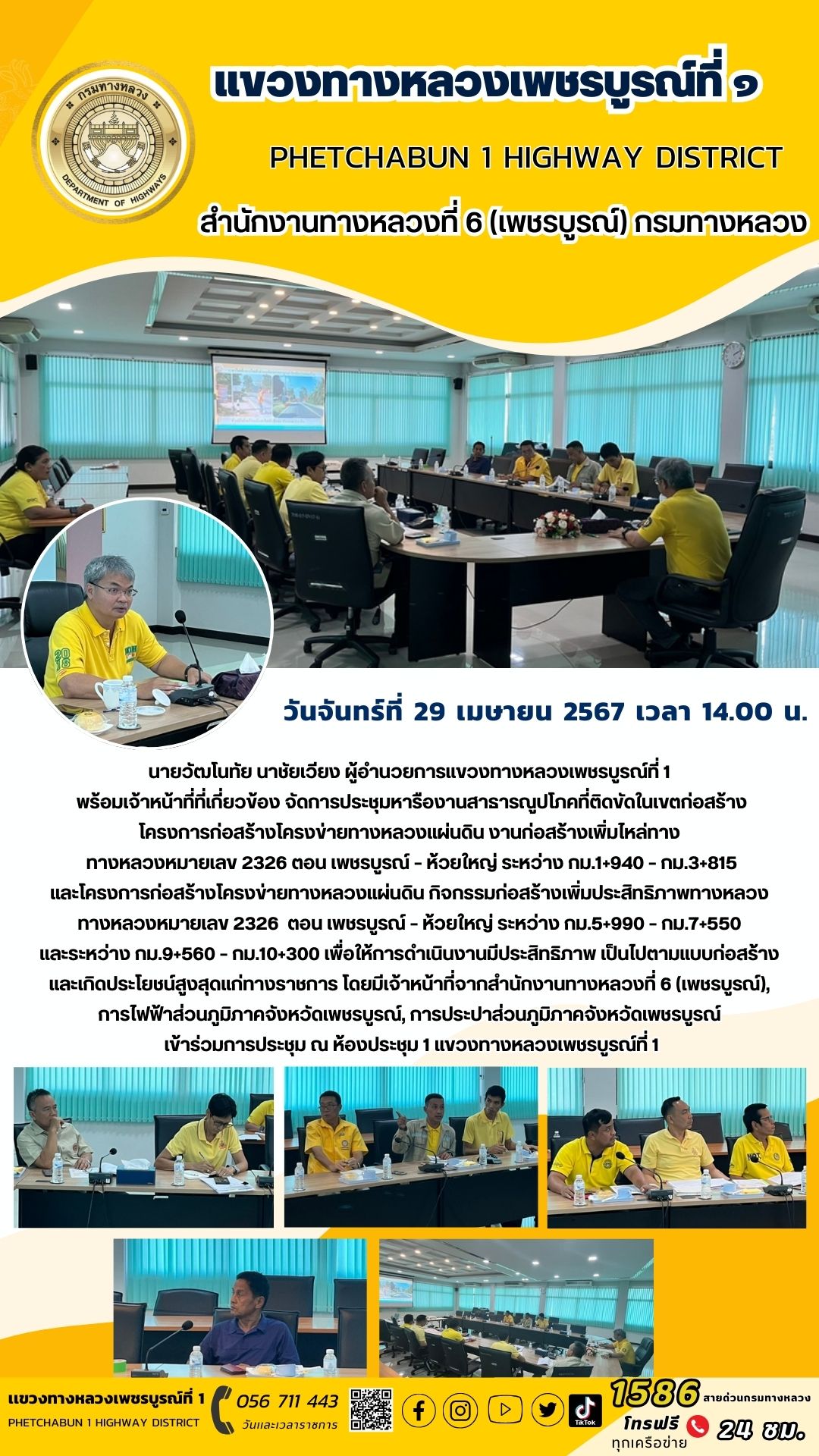 นายวัฒโนทัย นาชัยเวียง ผู้อำนวยการแขวงทางหลวงเพชรบูรณ์ที่ 1 พร้อมเจ้าหน้าที่ที่เกี่ยวข้อง จัดการประชุมหารืองานสาธารณูปโภคที่ติดขัดในเขตก่อสร้าง โครงการก่อสร้างโครงข่ายทางหลวงแผ่นดิน งานก่อสร้างเพิ่มไหล่ทาง ทางหลวงหมายเลข 2326 ตอน เพชรบูรณ์ – ห้วยใหญ่ ระหว่าง กม.1+940 – กม.3+815และโครงการก่อสร้างโครงข่ายทางหลวงแผ่นดิน กิจกรรมก่อสร้างเพิ่มประสิทธิภาพทางหลวง ทางหลวงหมายเลข 2326 ตอน เพชรบูรณ์ – ห้วยใหญ่ ระหว่าง กม.5+990 – กม.7+550 และระหว่าง กม.9+560 – กม.10+300 เพื่อให้การดำเนินงานมีประสิทธิภาพ เป็นไปตามแบบก่อสร้างและเกิดประโยชน์สูงสุดแก่ทางราชการ โดยมีเจ้าหน้าที่จากสำนักงานทางหลวงที่ 6 (เพชรบูรณ์), การไฟฟ้าส่วนภูมิภาคจังหวัดเพชรบูรณ์, การประปาส่วนภูมิภาคจังหวัดเพชรบูรณ์ เข้าร่วมการประชุม ณ ห้องประชุม 1 แขวงทางหลวงเพชรบูรณ์ที่ 1