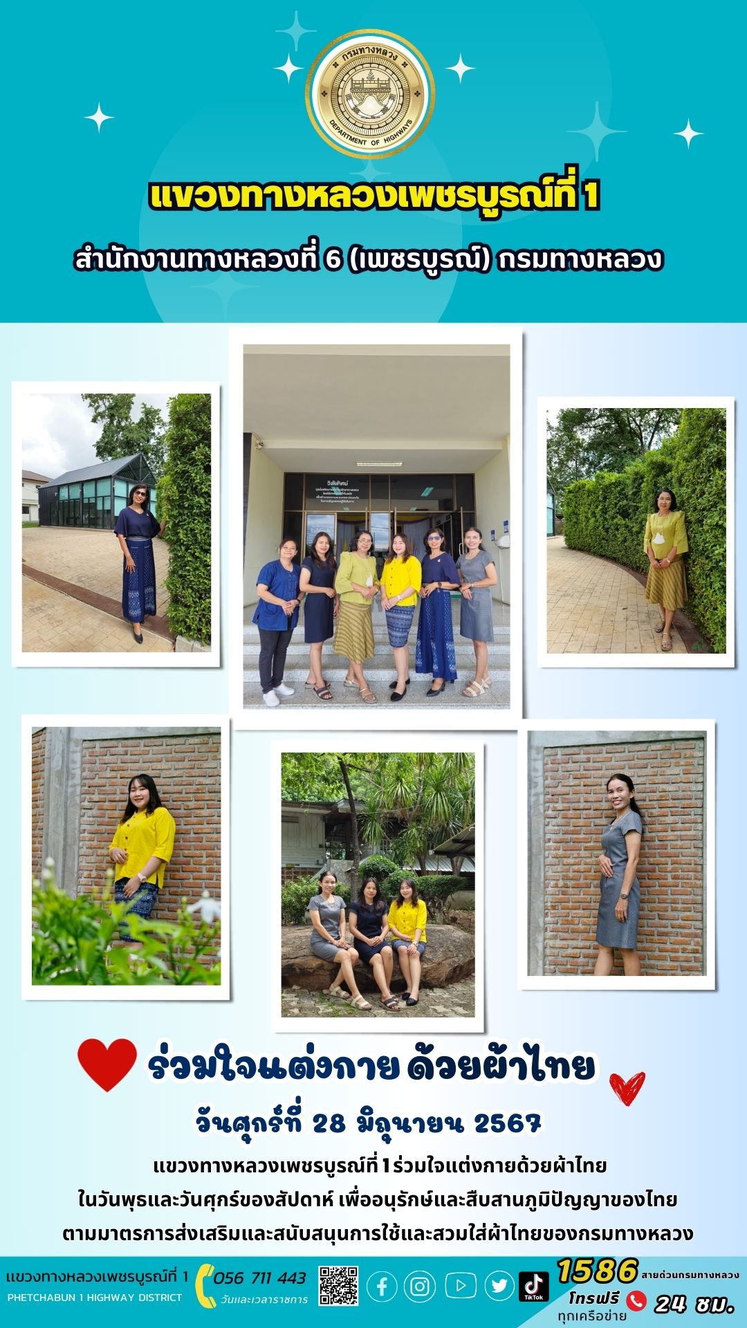 วันศุกร์ที่ 28 มิถุนายน 2567 แขวงทางหลวงเพชรบูรณ์ที่ 1 ร่วมใจแต่งกายด้วยผ้าไทยในวันพุธและวันศุกร์ของสัปดาห์ เพื่ออนุรักษ์และสืบสานภูมิปัญญาของไทยตามมาตรการส่งเสริมและสนับสนุนการใช้และสวมใส่ผ้าไทยของกรมทางหลวง