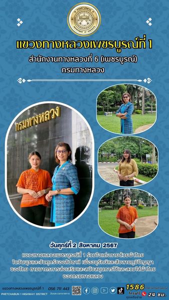 วันศุกร์ที่ 2 สิงหาคม 2567 แขวงทางหลวงเพชรบูรณ์ที่ 1 ร่วมใจแต่งกายด้วยผ้าไทยในวันพุธและวันศุกร์ของสัปดาห์ เพื่ออนุรักษ์และสืบสานภูมิปัญญาของไทย ตามมาตรการส่งเสริมและสนับสนุนการใช้และสวมใส่ผ้าไทยของกรมทางหลวง
