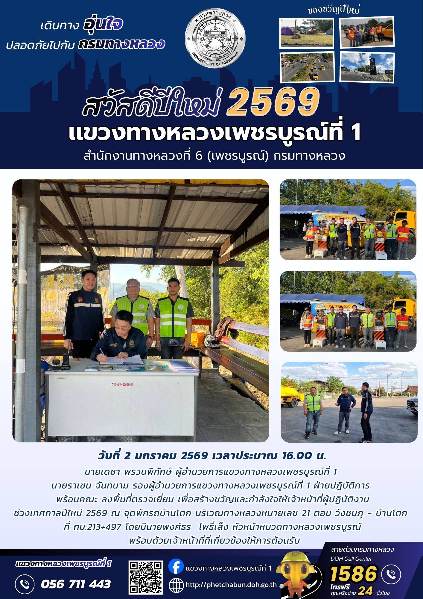 นายเดชา พรวนพิทักษ์ ผู้อำนวยการแขวงทางหลวงเพชรบูรณ์ที่ 1 นายราเชน จันทนาม รองผู้อำนวยการแขวงทางหลวงเพชรบูรณ์ที่ 1 ฝ่ายปฏิบัติการ พร้อมคณะ ลงพื้นที่ตรวจเยี่ยมเพื่อสร้างขวัญและกำลังใจให้เจ้าหน้าที่ผู้ปฏิบัติงานช่วงเทศกาลปีใหม่ 2569 ณ จุดพักรถบ้านโตก บริเวณทางหลวงหมายเลข 21 ตอน วังชมภู - บ้านโตก ที่ กม.213+497 โดยมีนายพงศ์ธร โพธิ์เส็ง หัวหน้าหมวดทางหลวงเพชรบูรณ์ พร้อมด้วยเจ้าหน้าที่ที่เกี่ยวข้องให้การต้อนรับ