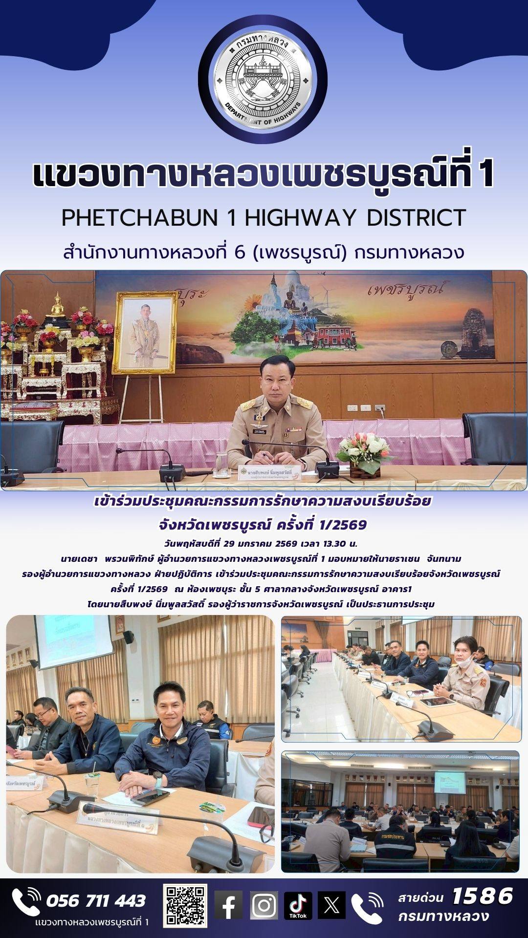 นายเดชา พรวนพิทักษ์ ผู้อำนวยการแขวงทางหลวงเพชรบูรณ์ที่ 1 มอบหมายให้นายราเชน จันทนาม รองผู้อำนวยการแขวงทางหลวง ฝ่ายปฏิบัติการ เข้าร่วมประชุมคณะกรรมการรักษาความสงบเรียบร้อยจังหวัดเพชรบูรณ์ ครั้งที่ 1/2569 ณ ห้องเพชบุระ ชั้น 5 ศาลากลางจังหวัดเพชรบูรณ์ อาคาร 1 โดยนายสืบพงษ์ นิ่มพูลสวัสดิ์ รองผู้ว่าราชการจังหวัดเพชรบูรณ์ เป็นประธานการประชุม