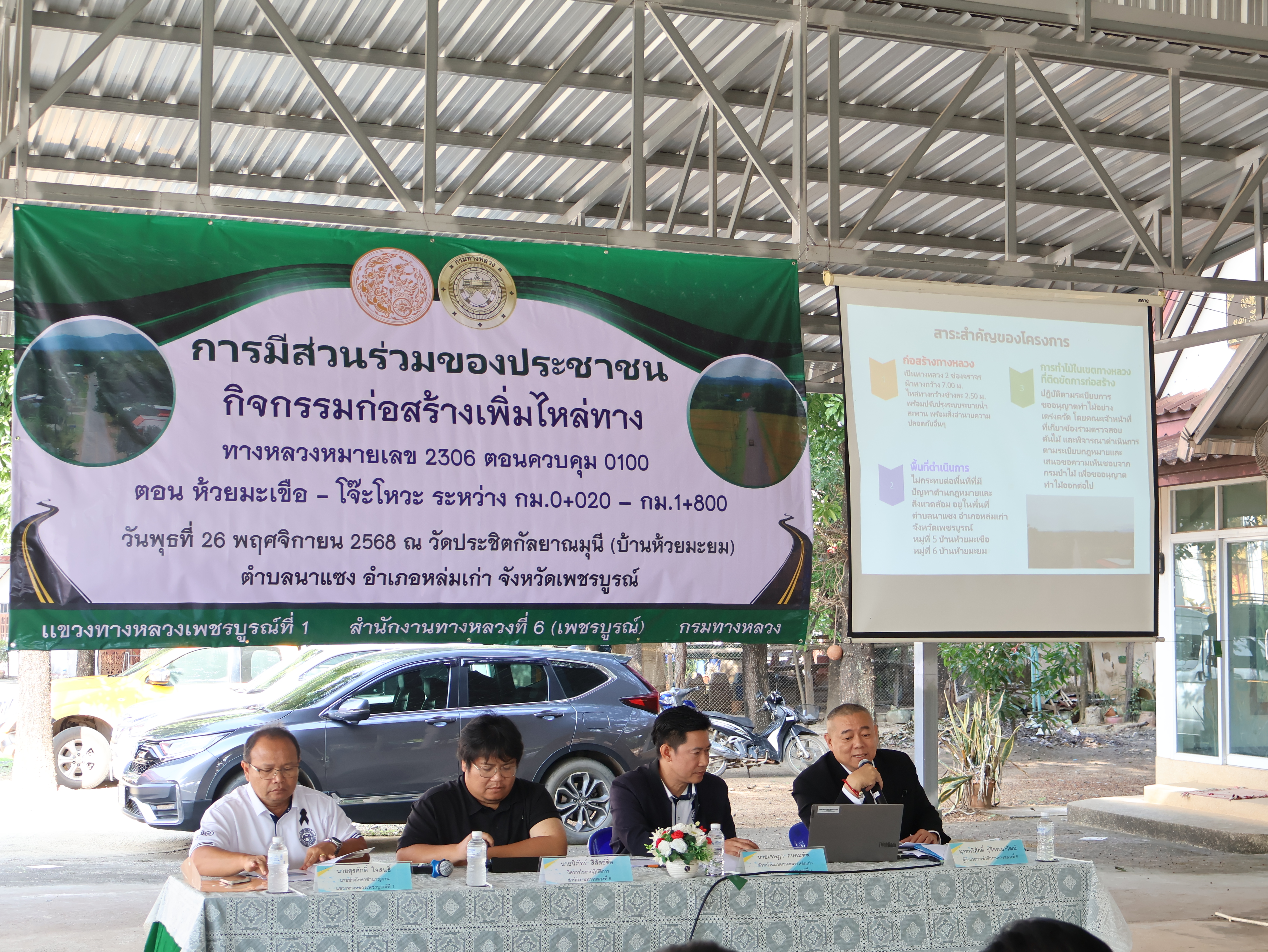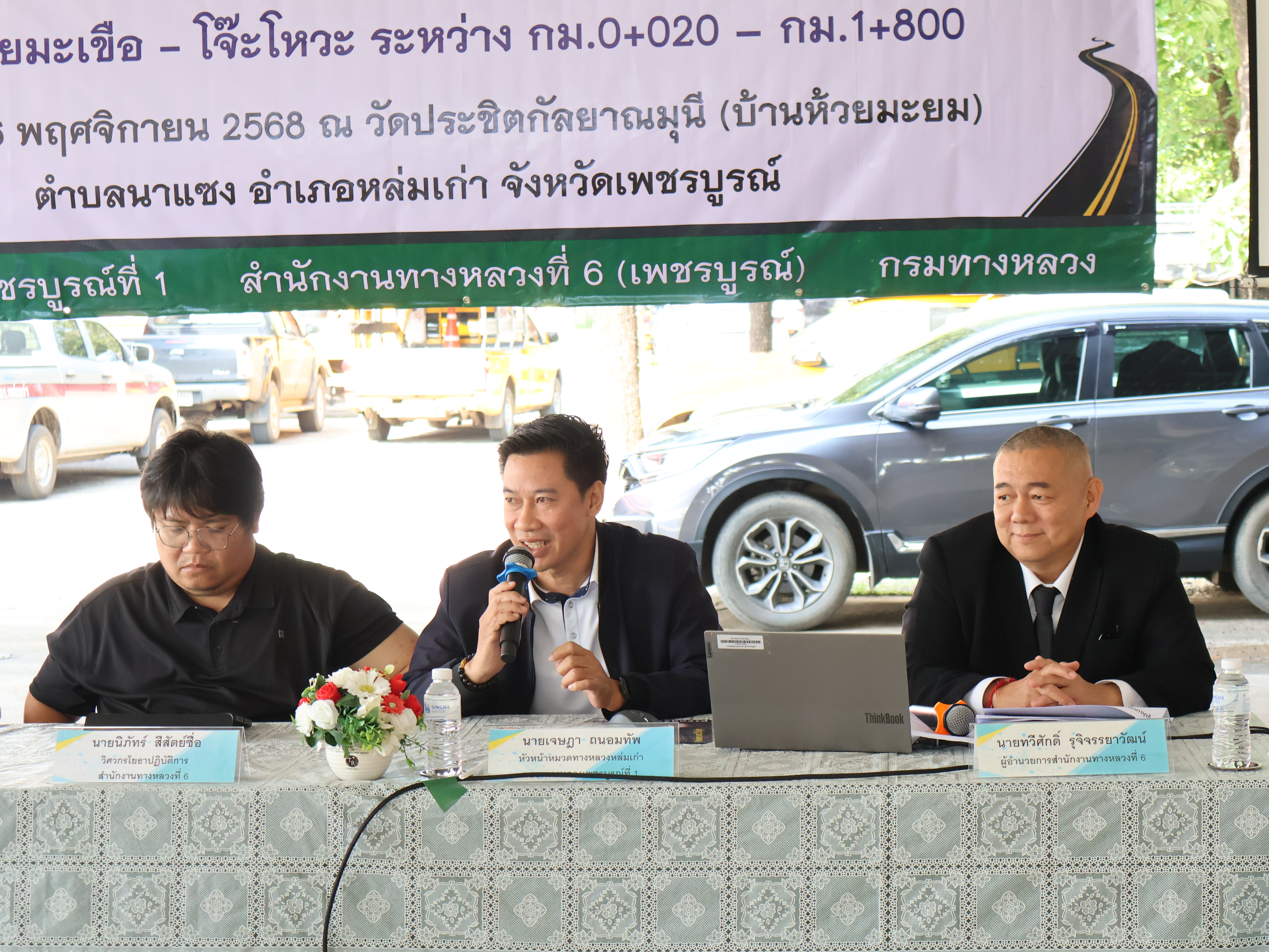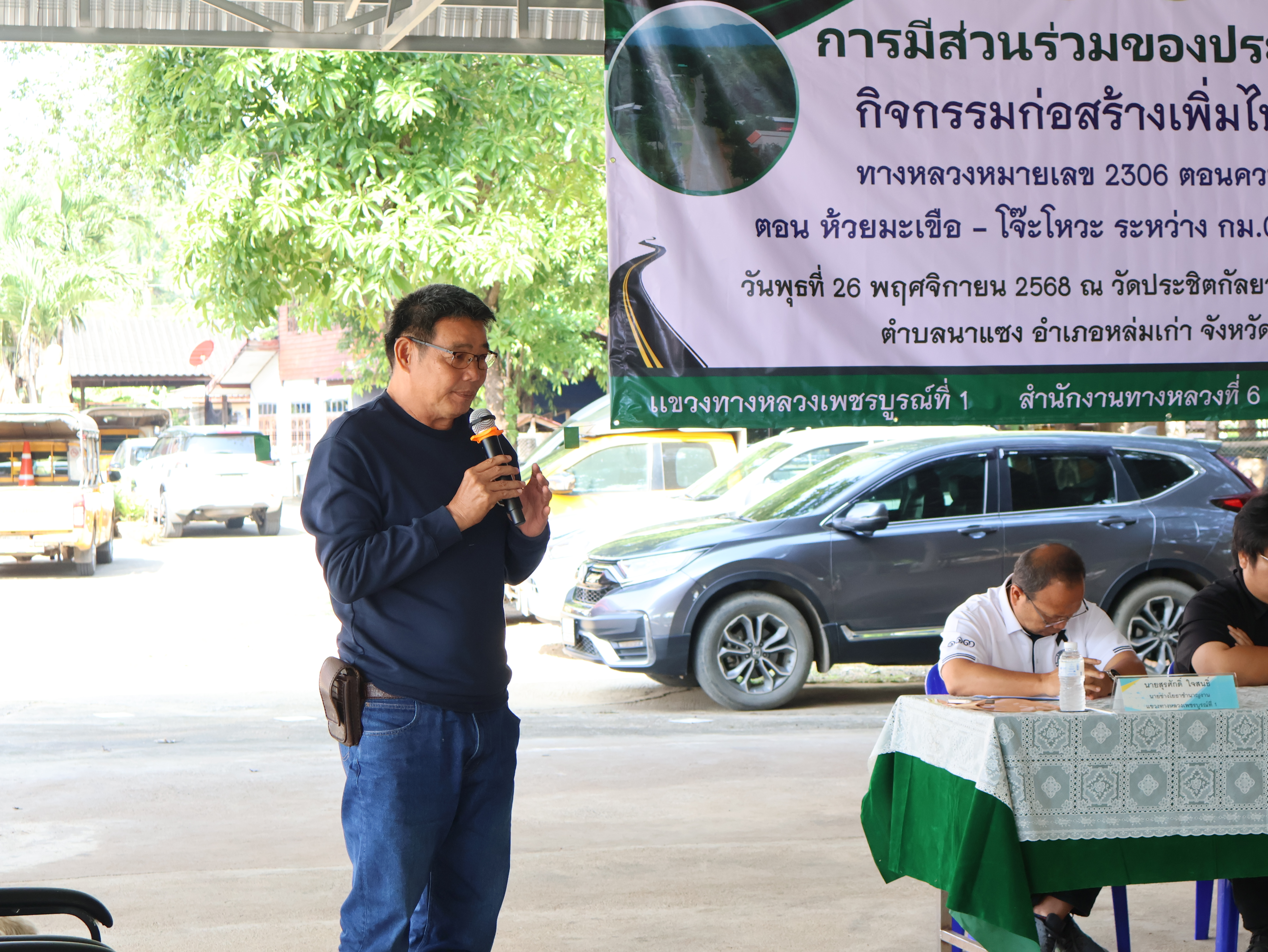 แขวงทางหลวงเพชรบูรณ์ที่ 1 ดำเนินการจัดการประชุมการมีส่วนร่วมของประชาชนในวันพุธที่ 26 พฤศจิกายน 2568 เวลา 09.00 – 11.30 น. ณ วัดประชิตกัลยาณมุนี (บ้านห้วยมะยม) ตำบลนาแซง อำเภอหล่มเก่า จังหวัดเพชรบูรณ์ โดยมี นายทวีศักดิ์ รุจิจรรยาวัฒน์ ผู้อำนวยการสำนักงานทางหลวงที่ 6 เป็นประธานเปิดการประชุม