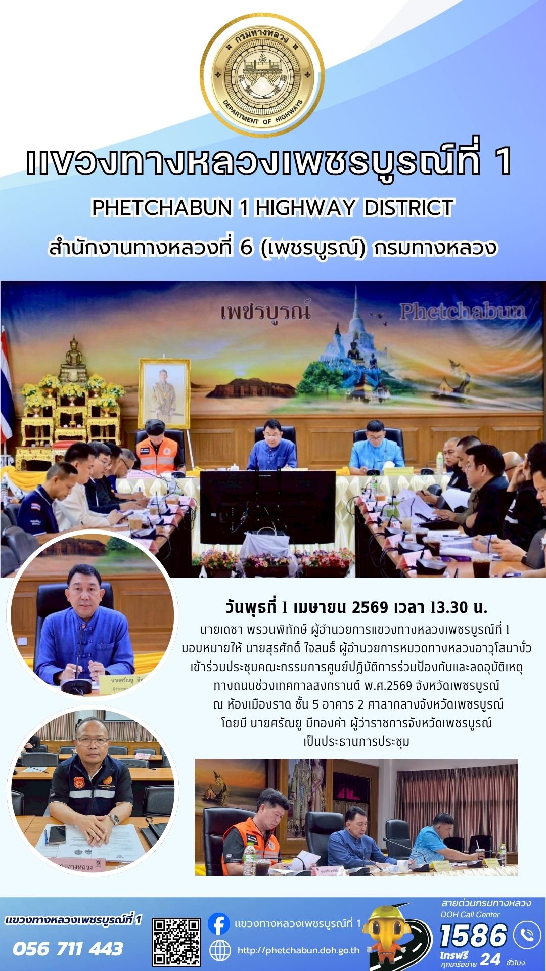 นายเดชา พรวนพิทักษ์ ผู้อำนวยการแขวงทางหลวงเพชรบูรณ์ที่ 1 มอบหมายให้ นายสุรศักดิ์ ใจสนธิ์ ผู้อำนวยการหมวดทางหลวงอาวุโสนางั่ว เข้าร่วมประชุมคณะกรรมการศูนย์ปฏิบัติการร่วมป้องกันและลดอุบัติเหตุทางถนนช่วงเทศกาลสงกรานต์ พ.ศ.2569 จังหวัดเพชรบูรณ์ ณ ห้องเมืองราด ชั้น 5 อาคาร 2 ศาลากลางจังหวัดเพชรบูรณ์ โดยมี นายศรัณยู มีทองคำ ผู้ว่าราชการจังหวัดเพชรบูรณ์ เป็นประธานการประชุม