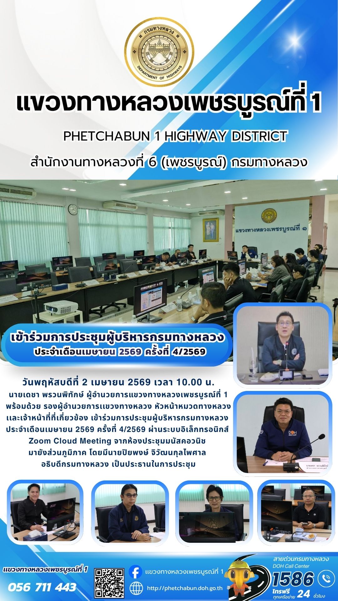 นายเดชา พรวนพิทักษ์ ผู้อำนวยการแขวงทางหลวงเพชรบูรณ์ที่ 1 พร้อมด้วย รองผู้อำนวยการเเขวงทางหลวง หัวหน้าหมวดทางหลวง เเละเจ้าหน้าที่ที่เกี่ยวข้อง เข้าร่วมการประชุมผู้บริหารกรมทางหลวง ประจำเดือนเมษายน 2569 ครั้งที่ 4/2569 ผ่านระบบอิเล็กทรอนิกส์ Zoom Cloud Meeting จากห้องประชุมมนัสคอวนิช มายังส่วนภูมิภาค โดยมีนายปิยพงษ์ จิวัฒนกุลไพศาล อธิบดีกรมทางหลวง เป็นประธานในการประชุม