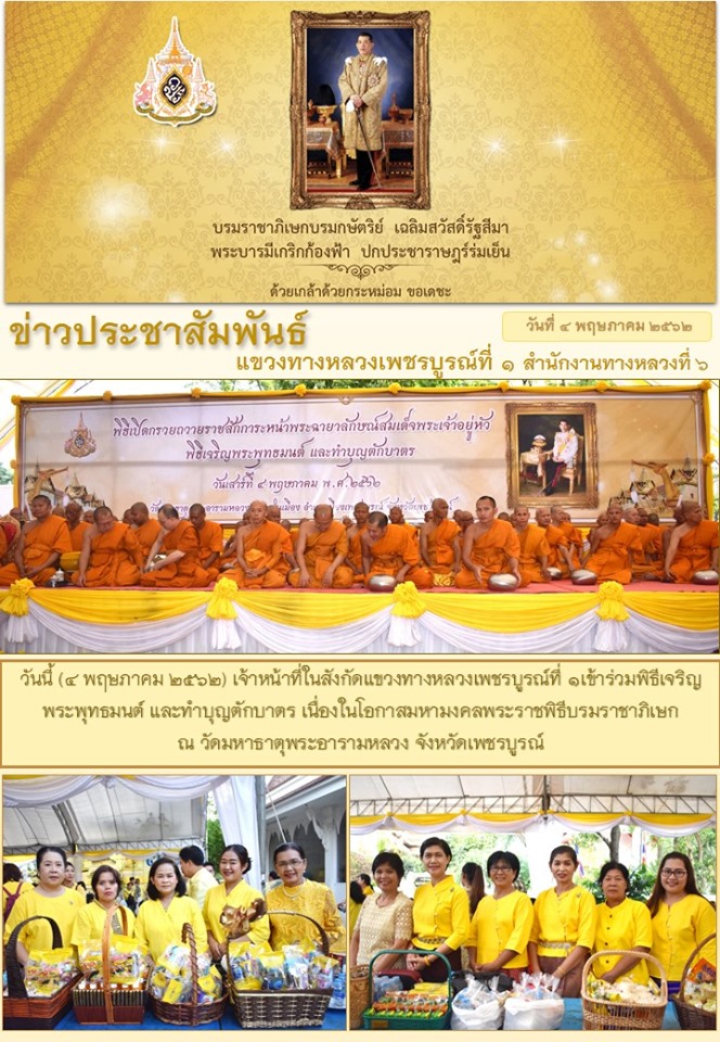 วันนี้ (4 พฤษภาคม 2562) เวลา 06.30 น. เจ้าหน้าที่ในสังกัดแขวงทางหลวงเพชรบูรณ์ที่ 1เข้าร่วมพิธีเจริญพระพุทธมนต์ และทำบุญตักบาตร เนื่องในโอกาสมหามงคลพระราชพิธีบรมราชาภิเษก ณ วัดมหาธาตุพระอารามหลวง จังหวัดเพชรบูรณ์