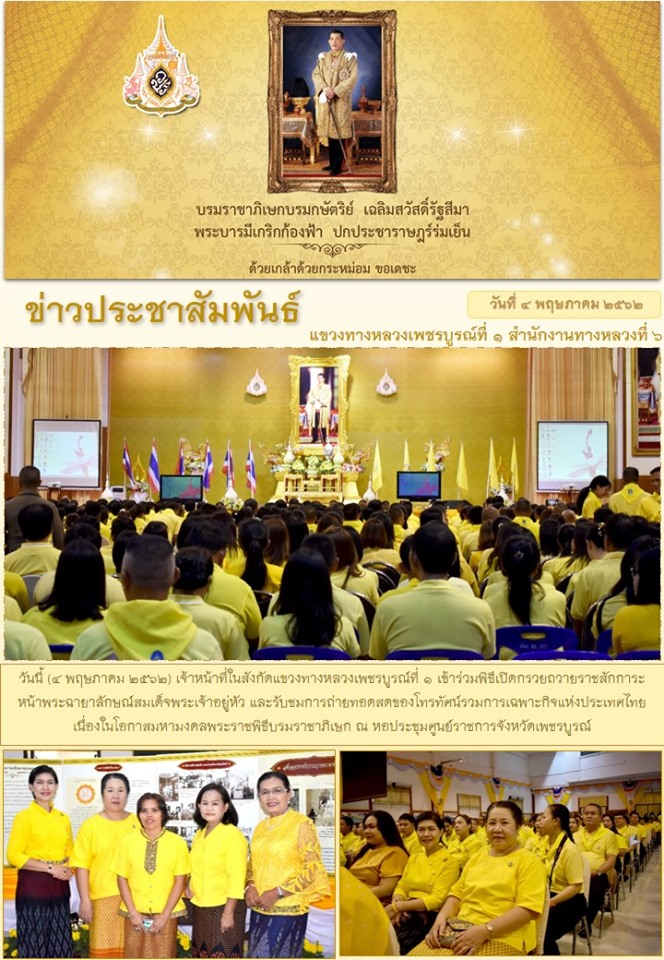 วันนี้ (5 พฤษภาคม 2562) เวลา 08.30น. แขวงทางหลวงเพชรบูรณ์ที่ 1 ร่วมพิธีเปิดกรวยถวายราชสักการะหน้าพระบรมฉายาลักษณ์พระบาทสมเด็จพระเจ้าอยู่หัว และรับชมการถ่ายทอดสดของโทรทัศน์รวมการเฉพาะกิจแห่งประเทศไทย เนื่องในโอกาสมหามงคมพระราชพิธีบรมราชาภิเษก ณ หอประชุมศูนย์ราชการจังหวัดเพชรบูรณ์