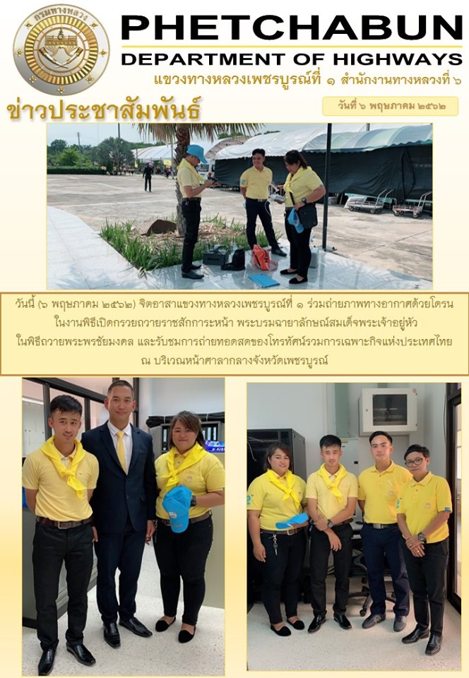 วันนี้ (6 พฤษภาคม 2562) จิตอาสาแขวงทางหลวงเพชรบูรณ์ที่ 1 ร่วมถ่ายภาพทางอากาศด้วยโดรนในงานพิธีเปิดกรวยถวายราชสักการะหน้า พระบรมฉายาลักษณ์สมเด็จพระเจ้าอยู่หัว ในพิธีถวายพระพรชัยมงคล และรับชมการถ่ายทอดสดของโทรทัศน์รวมการเฉพาะกิจแห่งประเทศไทย ณ บริเวณหน้าศาลากลางจังหวัดเพชรบูรณ์