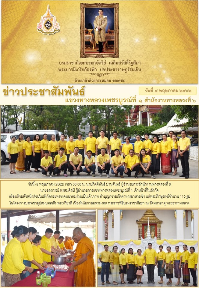 วันนี้ (8 พฤษภาคม 2562) เวลา 06.00 น. นายกิตติพันธ์ ปานจันทร์ ผู้อำนวยการสำนักงานทางหลวงที่ 6 นายอลงกรณ์ พรหมศิลป์ ผู้อำนวยการแขวงทางหลวงเพชรบูรณ์ที่ 1 เจ้าหน้าที่ในสังกัด พร้อมด้วยหัวหน้าส่วนในสังกัดกระทรวงคมนาคมร่วมเป็นเจ้าภาพ ทำบุญถวายภัตตาหารอาหารเช้า แด่พระภิกษุสงฆ์จำนวน 110 รูป ในโครงการบรรพชาอุปสมบทเฉลิมพระเกียรติ เนื่องในโอกาสมหามงคล พระราชพิธีบรมราชาภิเษก ณ วัดมหาธาตุ พระอารามหลวง