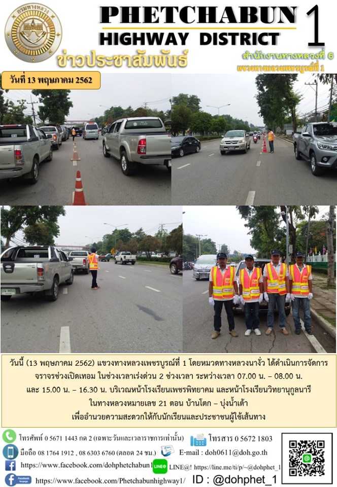 วันนี้ (13 พฤษภาคม 2562) แขวงทางหลวงเพชรบูรณ์ที่ 1 โดยหมวดทางหลวงนางั่วได้ดำเนินการจัดการจราจรช่วงเปิดเทอม ในช่วงเวลาเร่งด่วน 2 ช่วงเวลา ระหว่างเวลา 07.00 น. – 08.00 น. และ 15.00 น. – 16.30 น. บริเวณหน้าโรงเรียนเพชรพิทยาคม และหน้าโรงเรียนวิทยานุกูลนารี ในทางหลวงหมายเลข 21 ตอน บ้านโตก – บุ่งน้ำเต้า เพื่ออำนวยความสะดวกให้กับนักเรียนและประชาชนผู้ใช้เส้นทาง
