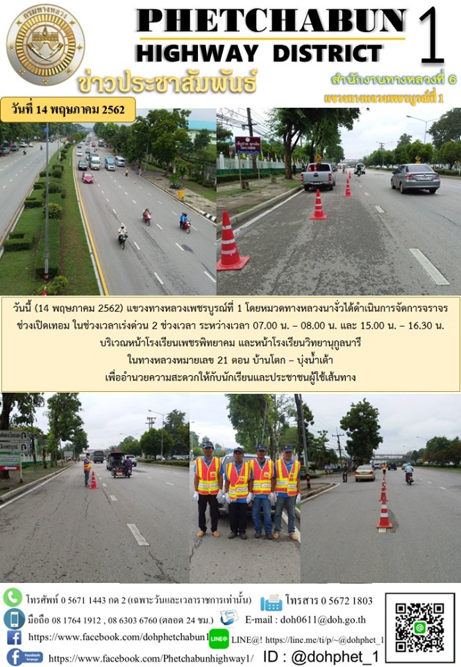 วันนี้ (14 พฤษภาคม 2562) เวลา 15.00 น. แขวงทางหลวงเพชรบูรณ์ที่ 1 โดยหมวดทางหลวงนางั่ว ได้ดำเนินการจัดการจราจรช่วงเปิดเทอม ในช่วงเวลาเร่งด่วน 2 ช่วงเวลา ระหว่างเวลา 07.00 น. – 08.00 น. และ 15.00 น. – 16.30 น. บริเวณหน้าโรงเรียนเพชรพิทยาคม และหน้าโรงเรียนวิทยานุกูลนารี ในทางหลวงหมายเลข 21 ตอน บ้านโตก – บุ่งน้ำเต้า เพื่ออำนวยความสะดวกให้กับนักเรียนและประชาชนผู้ใช้ทาง