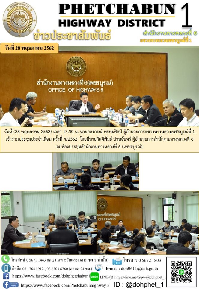 วันนี้ (28 พฤษภาคม 2562) เวลา 13.30 น. นายอลงกรณ์ พรหมศิลป์ ผู้อำนวยการแขวงทางหลวงเพชรบูรณ์ที่ 1 เข้าร่วมประชุมประจำเดือน ครั้งที่ 4/2562 โดยมีนายกิตติพันธ์ ปานจันทร์ ผู้อำนวยการสำนักงานทางหลวงที่ 6 ณ ห้องประชุมสำนักงานทางหลวงที่ 6 (เพชรบูรณ์)