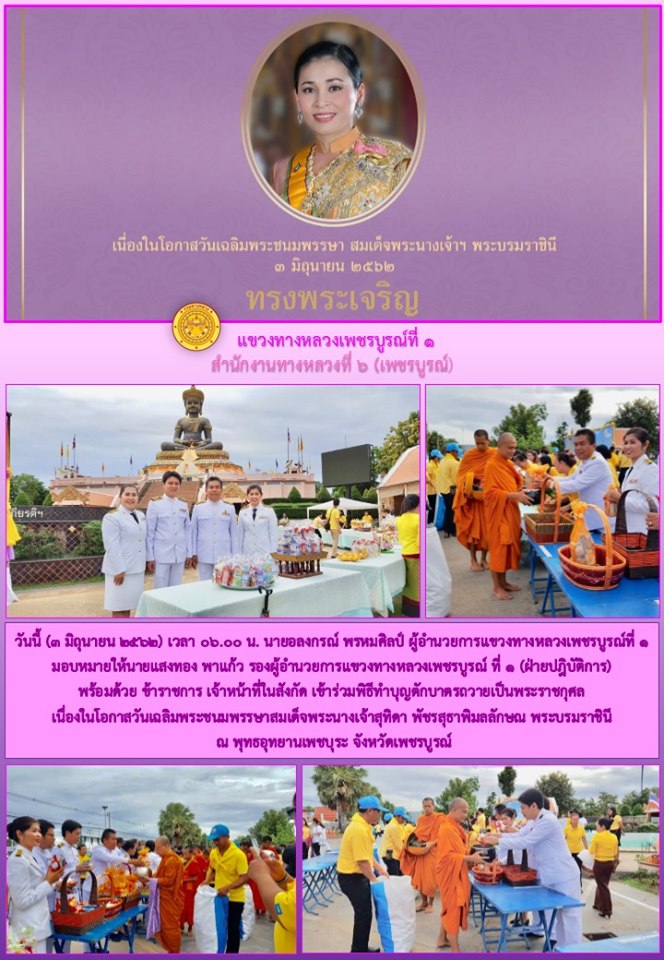 วันนี้ (3 มิถุนายน 2562) เวลา 06.00 น. นายอลงกรณ์ พรหมศิลป์ ผู้อำนวยการแขวงทางหลวงเพชรบูรณ์ที่ 1 มอบหมายให้นายแสงทอง พาแก้ว รองผู้อำนวยการแขวงทางหลวงเพชรบูรณ์ ที่ 1 (ฝ่ายปฎิบัติการ) พร้อมด้วย ข้าราชการ เจ้าหน้าที่ในสังกัด เข้าร่วมพิธีทำบุญตักบาตรถวายเป็นพระราชกุศล เนื่องในโอกาสวันเฉลิมพระชนมพรรษาสมเด็จพระนางเจ้าสุทิดา พัชรสุธาพิมลลักษณ พระบรมราชินี ณ พุทธอุทยานเพชบุระ จังหวัดเพชรบูรณ์