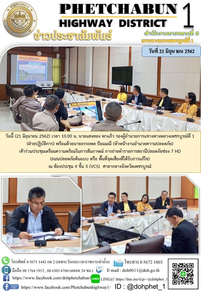 วันนี้ (21 มิถุนายน 2562) เวลา 10.00 น. นายแสงทอง พาแก้ว รองผู้อำนวยการแขวงทางหลวงเพชรบูรณ์ที่ 1 (ฝ่ายปฏิบัติการ) พร้อมด้วยนายอรรถพล ป้อมมณี (หัวหน้างานอำนวยความปลอดภัย) เข้าร่วมประชุมเตรียมความพร้อมในการสัมภาษณ์ การถ่ายทำรายการสถานีปลอดภัยช่อง 7 HD (ถนนปลอดภัยต้นแบบ หรือ พื้นที่จุดเสี่ยงที่ได้รับการแก้ไข) ณ ห้องประชุม 4 ชั้น 5 (VCS) ศาลากลางจังหวัดเพชรบูรณ์