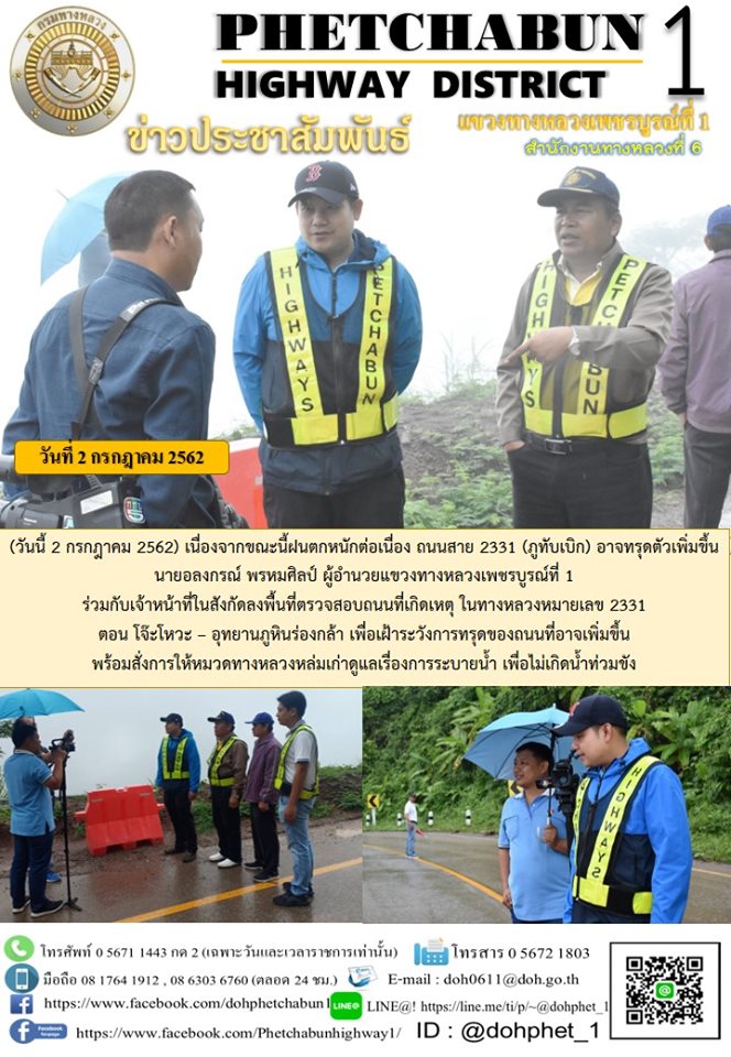 เนื่องจากขณะนี้ฝนตกหนักต่อเนื่อง ถนนสาย 2331 (ภูทับเบิก) อาจทรุดตัวเพิ่มขึ้น นายอลงกรณ์ พรหมศิลป์ ผู้อำนวยแขวงทางหลวงเพชรบูรณ์ที่ 1 ร่วมกับเจ้าหน้าที่ในสังกัดลงพื้นที่ตรวจสอบถนนที่เกิดเหตุ ในทางหลวงหมายเลข 2331 ตอน โจ๊ะโหวะ – อุทยานภูหินร่องกล้า เพื่อเฝ้าระวังการทรุดของถนนที่อาจเพิ่มขึ้น พร้อมสั่งการให้หมวดทางหลวงหล่มเก่าดูแลเรื่องการระบายน้ำ เพื่อไม่เกิดน้ำท่วมขัง