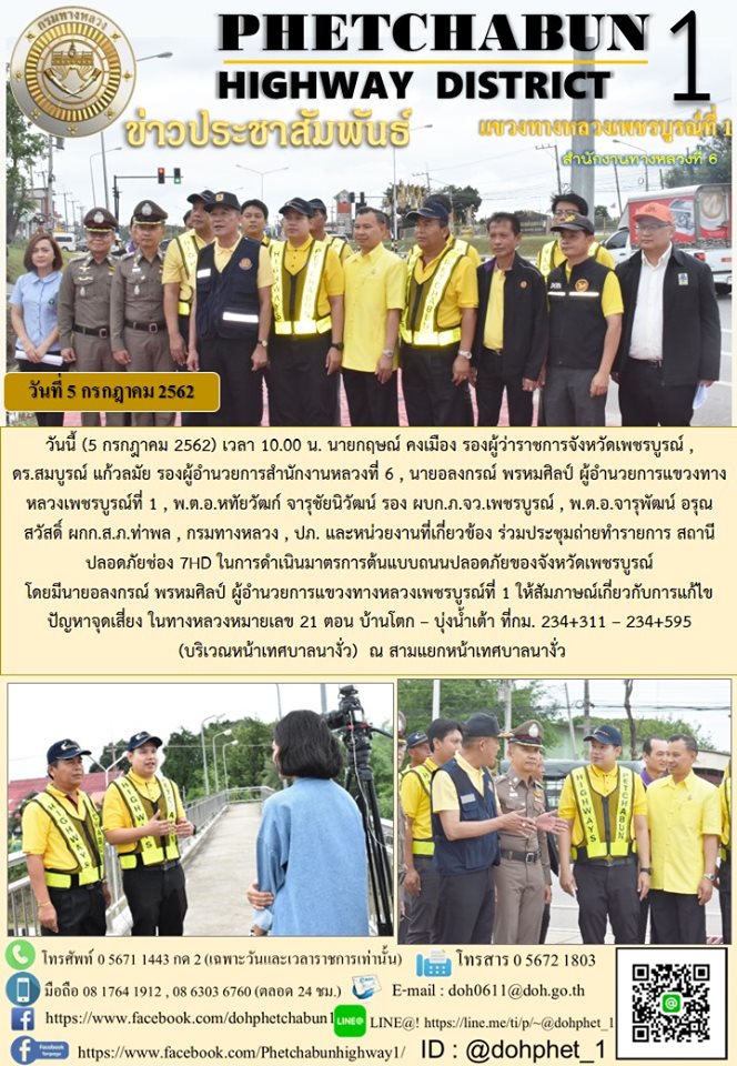 วันนี้ (5 กรกฎาคม 2562) เวลา 10.00 น. นายกฤษณ์ คงเมือง รองผู้ว่าราชการจังหวัดเพชรบูรณ์ , ดร.สมบูรณ์ แก้วลมัย รองผู้อำนวยการสำนักงานหลวงที่ 6 , นายอลงกรณ์ พรหมศิลป์ ผู้อำนวยการแขวงทางหลวงเพชรบูรณ์ที่ 1 , พ.ต.อ.หทัยวัฒก์ จารุชัยนิวัฒน์ รอง ผบก.ภ.จว.เพชรบูรณ์ , พ.ต.อ.จารุพัฒน์ อรุณสวัสดิ์ ผกก.ส.ภ.ท่าพล , กรมทางหลวง , ปภ. และหน่วยงานที่เกี่ยวข้อง ร่วมประชุมถ่ายทำรายการ สถานีปลอดภัยช่อง 7HD ในการดำเนินมาตรการต้นแบบถนนปลอดภัยของจังหวัดเพชรบูรณ์