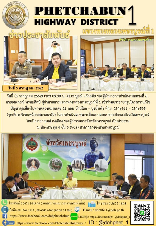วันนี้ (5 กรกฎาคม 2562) เวลา 09.30 น. ดร.สมบูรณ์ แก้วลมัย รองผู้อำนวยการสำนักงานหลวงที่ 6 , นายอลงกรณ์ พรหมศิลป์ ผู้อำนวยการแขวงทางหลวงเพชรบูรณ์ที่ 1 เข้าร่วมบรรยายสรุปโครงการแก้ไขปัญหาจุดเสี่ยงในทางหลวงหมายเลข 21 ตอน บ้านโตก – บุ่งน้ำเต้า ที่กม. 234+311 – 234+595 (จุดเสี่ยงบริเวณหน้าเทศบาลนางั่ว) ในการดำเนินมาตรการต้นแบบถนนปลอดภัยของจังหวัดเพชรบูรณ์