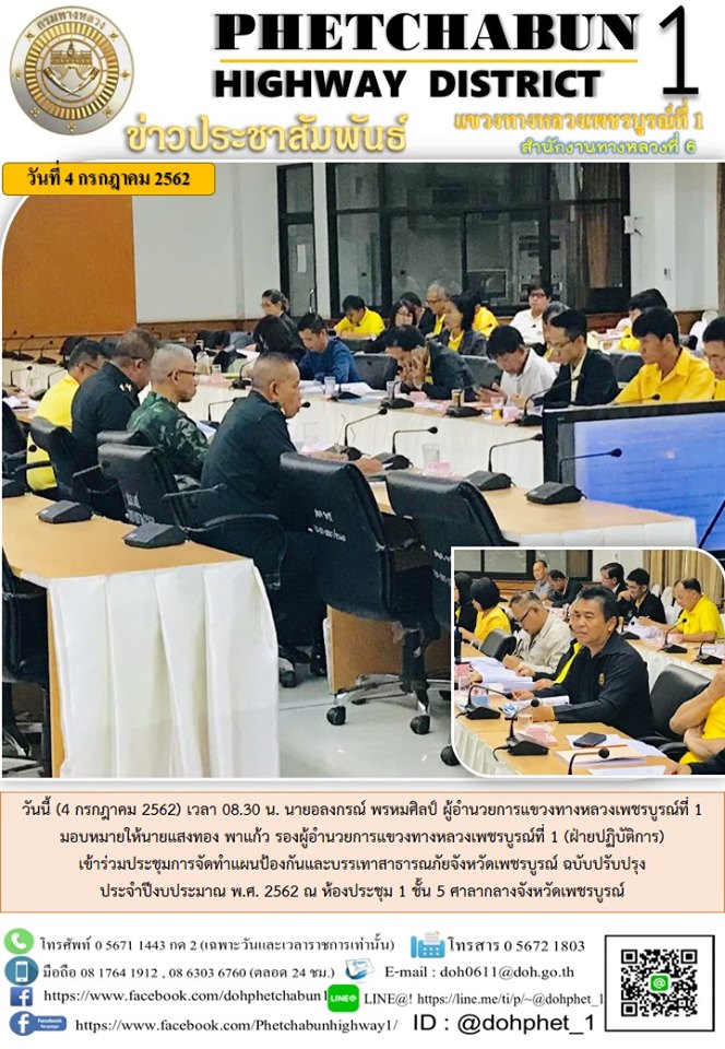 วันนี้ (4 กรกฎาคม 2562) เวลา 08.30 น. นายอลงกรณ์ พรหมศิลป์ ผู้อำนวยการแขวงทางหลวงเพชรบูรณ์ที่ 1 มอบหมายให้นายแสงทอง พาแก้ว รองผู้อำนวยการแขวงทางหลวงเพชรบูรณ์ที่ 1 (ฝ่ายปฏิบัติการ) เข้าร่วมประชุมการจัดทำแผนป้องกันและบรรเทาสาธารณภัยจังหวัดเพชรบูรณ์ ฉบับปรับปรุง ประจำปีงบประมาณ พ.ศ. 2562 ณ ห้องประชุม 1 ชั้น 5 ศาลากลางจังหวัดเพชรบูรณ์