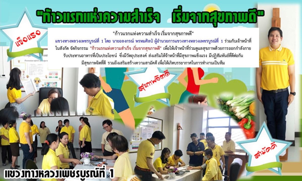 แขวงทางหลวงเพชรบูรณ์ที่ 1 โดย นายอลงกรณ์ พรหมศิลป์ ผู้อำนวยการแขวงทางหลวงเพชรบูรณ์ที่ 1 ร่วมกับเจ้าหน้าที่ในสังกัด จัดกิจกรรม "ก้าวแรกแห่งความสำเร็จ เริ่มจากสุขภาพดี" เพื่อให้เจ้าหน้าที่ร่วมดูแลสุขภาพด้วยการออกกำลังกาย รับประทานอาหารที่เป็นประโยชน์ ซึ่งมีวัตถุประสงค์ ส่งเสริมให้จ้าหน้าที่มีสุขภาพแข็งแรง มีปฏิสัมพันธ์ที่ดีต่อกัน มีสุขภาพจิตที่ดี รวมถึงเสริมสร้างความสามัคคี เพื่อให้เกิดบรรยากาศในการทำงานเป็นทีม