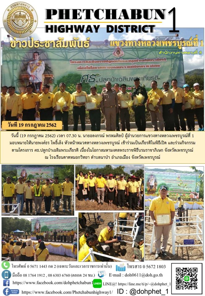 วันนี้ (19 กรกฎาคม 2562) เวลา 07.30 น. นายอลงกรณ์ พรหมศิลป์ ผู้อำนวยการแขวงทางหลวงเพชรบูรณ์ที่ 1 มอบหมายให้นายพงศ์ธร โพธิ์เส็ง หัวหน้าหมวดทางหลวงเพชรบูรณ์ เข้าร่วมเป็นเกียรติในพิธีเปิด และร่วมกิจกรรมตามโครงการ ศธ.ปลูกป่าเฉลิมพระเกียรติ เนื่องในโอกาสมหามงคลพระราชพิธีบรมราชาภิเษก จังหวัดเพชรบูรณ์ ณ โรงเรียนตาดหมอกวิทยา ตำบลนาป่า อำเภอเมือง จังหวัดเพชรบูรณ์