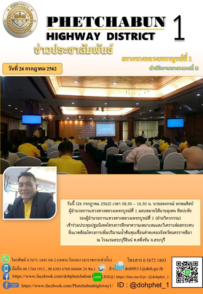 วันนี้ (26 กรกฎาคม 2562) เวลา 08.30 – 16.30 น. นายอลงกรณ์ พรหมศิลป์ ผู้อำนวยการแขวงทางหลวงเพชรบูรณ์ที่ 1 มอบหมายให้นายสุเทพ ศิลปะชัย รองผู้อำนวยการแขวงทางหลวงเพชรบูรณ์ที่ 1 (ฝ่ายวิศวกรรม) เข้าร่วมประชุมปฐมนิเทศโครงการศึกษาความเหมาะสมและวิเคราะห์ผลกระทบสิ่งแวดล้อมโครงการเพิ่มปริมาณน้ำต้นทุนเขื่อนลำตะคองจังหวัดนครราชสีมา ณ โรงแรมสระบุรีอินน์ ต.ตลิ่งชัน จ.สระบุรี
