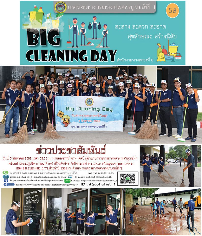 วันนี้ (5 สิงหาคม 2562) เวลา 09.00 น. นายอลงกรณ์ พรหมศิลป์ ผู้อำนวยการแขวงทางหลวงเพชรบูรณ์ที่ 1 พร้อมด้วยคณะผู้บริหาร และเจ้าหน้าที่ในสังกัดฯ จัดกิจกรรมทำความสะอาดใหญ่ของกรมทางหลวง(DOH Big Cleaning Day) ประจำปี 2562 ณ สำนักงานแขวงทางหลวงเพชรบูรณ์ที่ 1