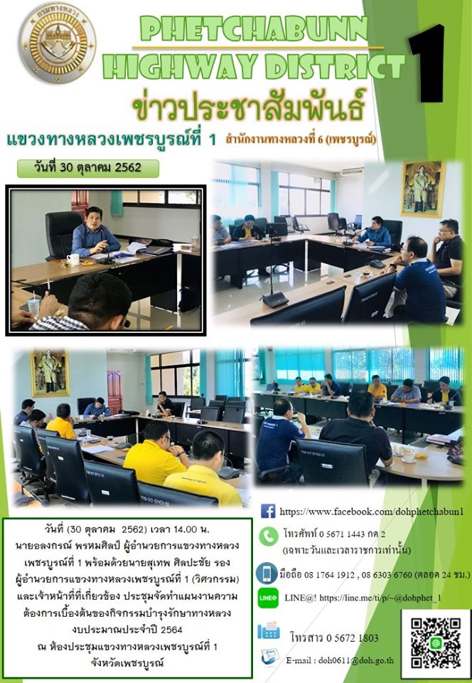 วันที่ (30 ตุลาคม 2562) เวลา 14.00 น. นายอลงกรณ์ พรหมศิลป์ ผู้อำนวยการแขวงทางหลวงเพชรบูรณ์ที่ 1 พร้อมด้วยนายสุเทพ ศิลปะชัย รองผู้อำนวยการแขวงทางหลวงเพชรบูรณ์ที่ 1 (วิศวกรรม) และเจ้าหน้าที่ที่เกี่ยวข้อง ประชุมจัดทำแผนงานความต้องการเบื้องต้นของกิจกรรมบำรุงรักษาทางหลวง งบประมาณประจำปี 2564 ณ ห้องประชุมแขวงทางหลวงเพชรบูรณ์ที่ 1 จังหวัดเพชรบูรณ์