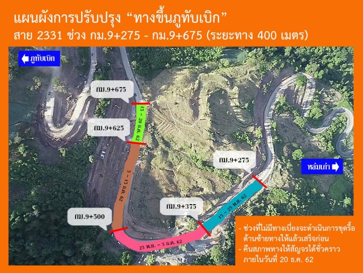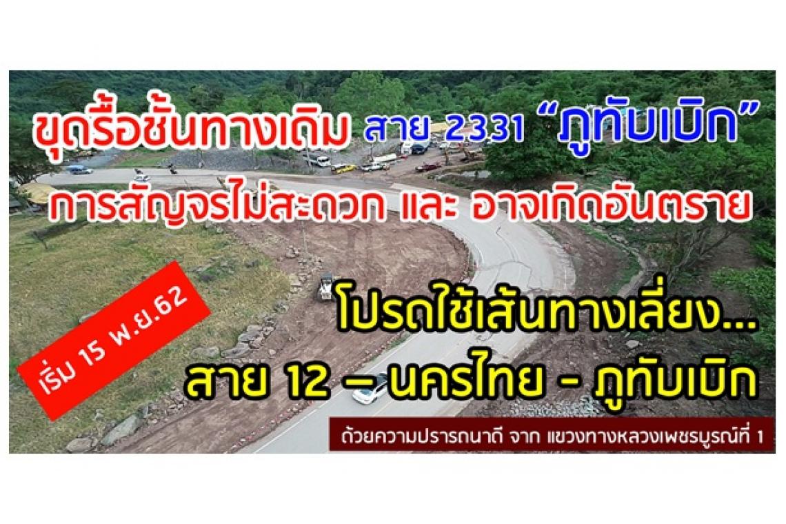 ขณะนี้แขวงทางหลวงเพชรบูรณ์ที่ 1 ได้เร่งดำเนินการเพื่อบรรเทาความเดือดร้อนของผู้ใช้ทางและนักท่องเที่ยว โดยจะขุดรื้อชั้นทางเดิม ในช่วงก่อสร้าง สาย 2331 ตอน 2 ช่วง กม.9+425 – กม.9+700 ในวันที่ 15 พฤศจิกายน 2562 และจะทำการคืนสภาพทาง และเปิดพื้นที่ให้บริการชั่วคราวอีกครั้ง ในช่วง กลางเดือน ธันวาคม 2562 ซึ่งทำให้การสัญจรเกิดความไม่สะดวก และอาจเกิดอันตราย จึงขอประชาสัมพันธ์ให้ผู้ใช้ทางและนักท่องเที่ยว ใช้เส้นทาง สาย 12 – นครไทย – ภูทับเบิก แทน และขออภัยในความไม่สะดวกมา ณ โอกาส นี้แขวงทางหลวงเพชรบูรณ์ที่ 1 ขอแนะนำเส้นทางเลี่ยง ดังนี้