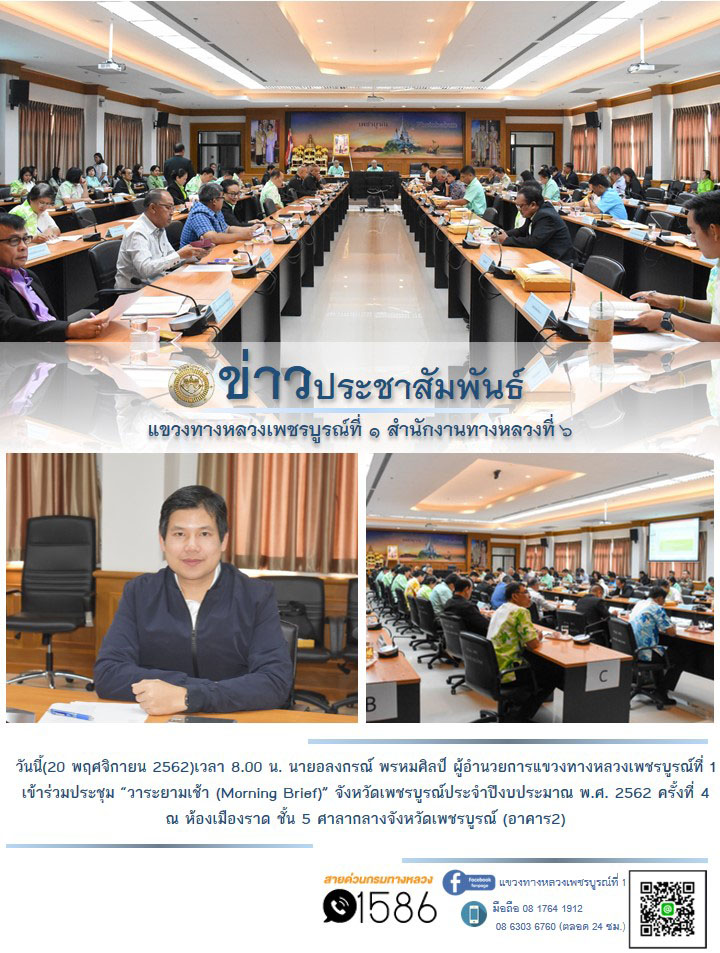 วันนี้(20 พฤศจิกายน 2562)เวลา 8.00 น. นายอลงกรณ์ พรหมศิลป์ ผู้อำนวยการแขวงทางหลวงเพชรบูรณ์ที่ 1เข้าร่วมประชุม “วาระยามเช้า (Morning Brief)” จังหวัดเพชรบูรณ์ประจำปีงบประมาณ พ.ศ. 2562 ครั้งที่ 4ณ ห้องเมืองราด ชั้น 5 ศาลากลางจังหวัดเพชรบูรณ์ (อาคาร2)