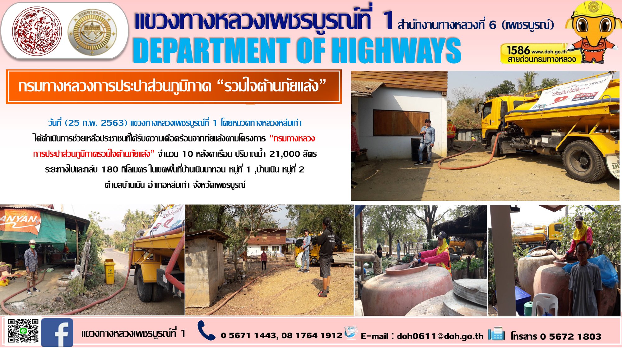วันที่ (25 ก.พ. 2563) แขวงทางหลวงเพชรบูรณ์ที่ 1 โดยหมวดทางหลวงหล่มเก่าได้ดำเนินการช่วยเหลือประชาชนที่ได้รับความเดือดร้อนจากภัยแล้งตามโครงการ “กรมทางหลวง การประปาส่วนภูมิภาครวมใจต้านภัยแล้ง” จำนวน 10 หลังคาเรือน ปริมาณน้ำ 21,000 ลิตร ระยะทางไปและกลับ 180 กิโลเมตร ในเขตพื้นที่บ้านเนินนาทอน หมู่ที่ 1 ,บ้านเนิน หมู่ที่ 2ตำบลบ้านเนิน อำเภอหล่มเก่า จังหวัดเพชรบูรณ์